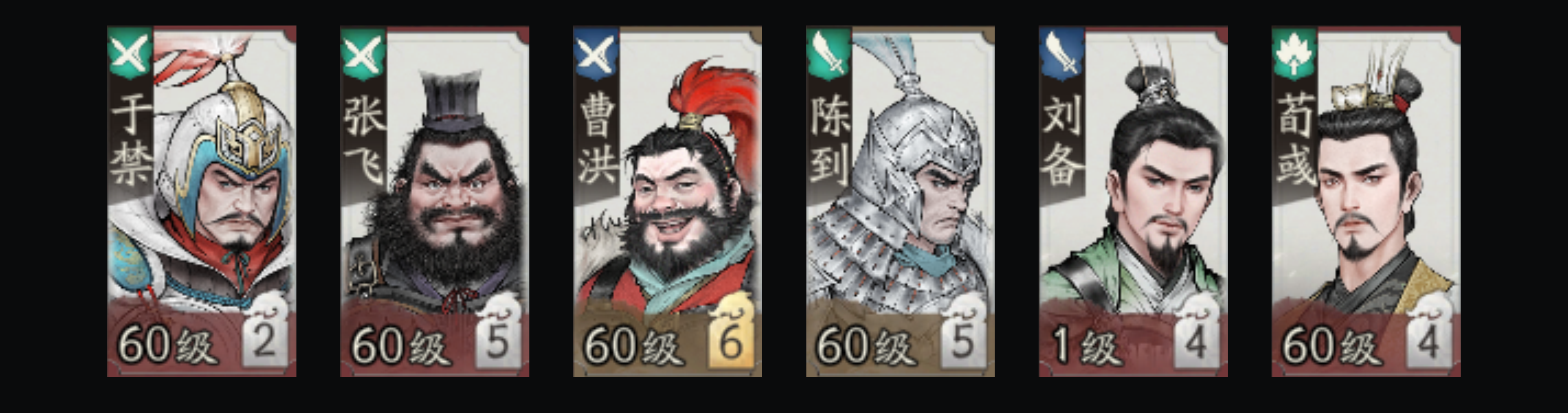 于禁、张飞、曹洪、陈到、刘备、荀彧