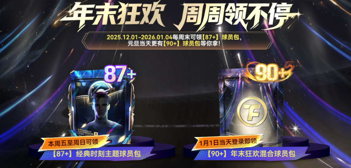 2025.12.01-2026.01.04每周末可领【87+】球员包,元旦当天更有【90+】球员包等你拿!狂欢不止一天,惊喜没有停歇!年末的每一个周末,都是献给主帅们的专属福利时刻。本周五至周日登录即可领取【87+】经典时刻主题球员包。当新年的钟声临近,别忘了还有压轴豪礼重磅来袭!