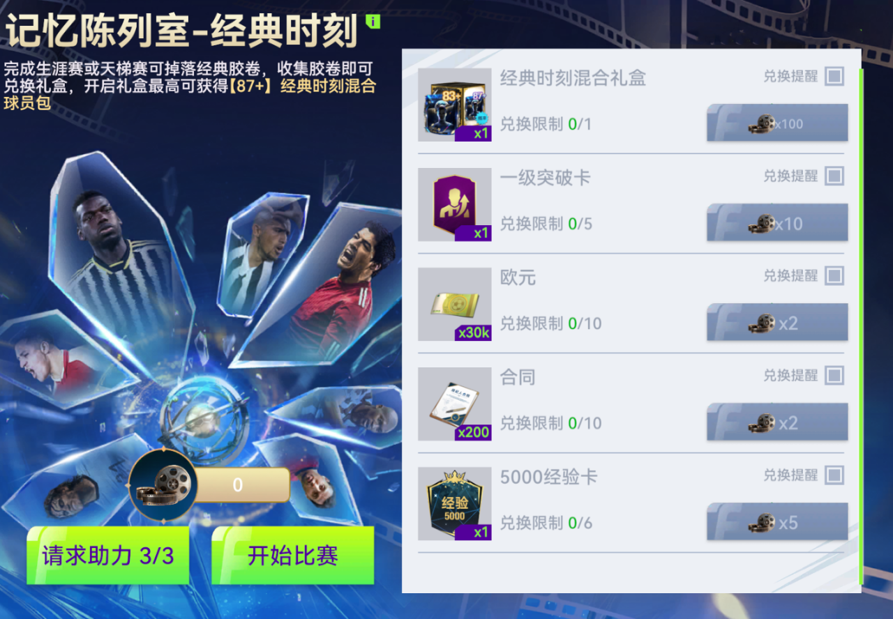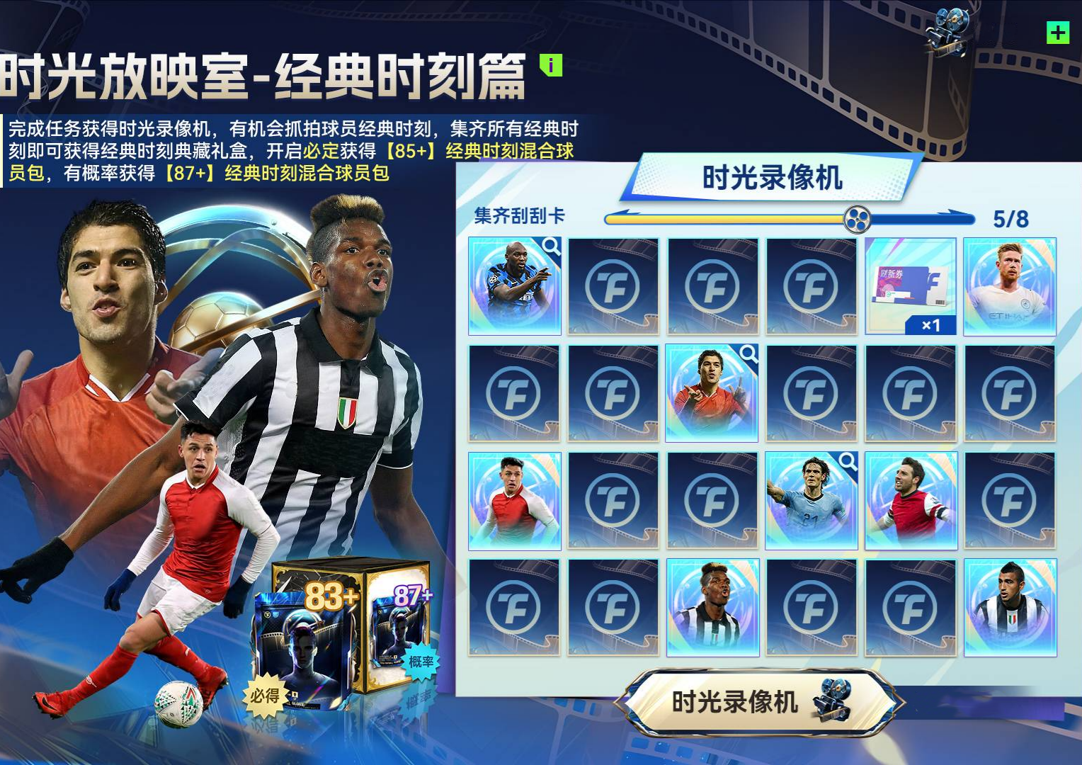 完成任务获得时光录像机,有机会抓拍球员经典时刻,集齐所有经典时刻即可获得经典时刻典藏礼盒,开启必定获得【85+】经典时刻混合球员包,有概率获得【87+】经典时刻混合球员包。那些决定胜负、定义时代的瞬间,再次被定格、被重现。当所有经典被你一一收录,专属好礼也将由各位主帅亲手打开!
