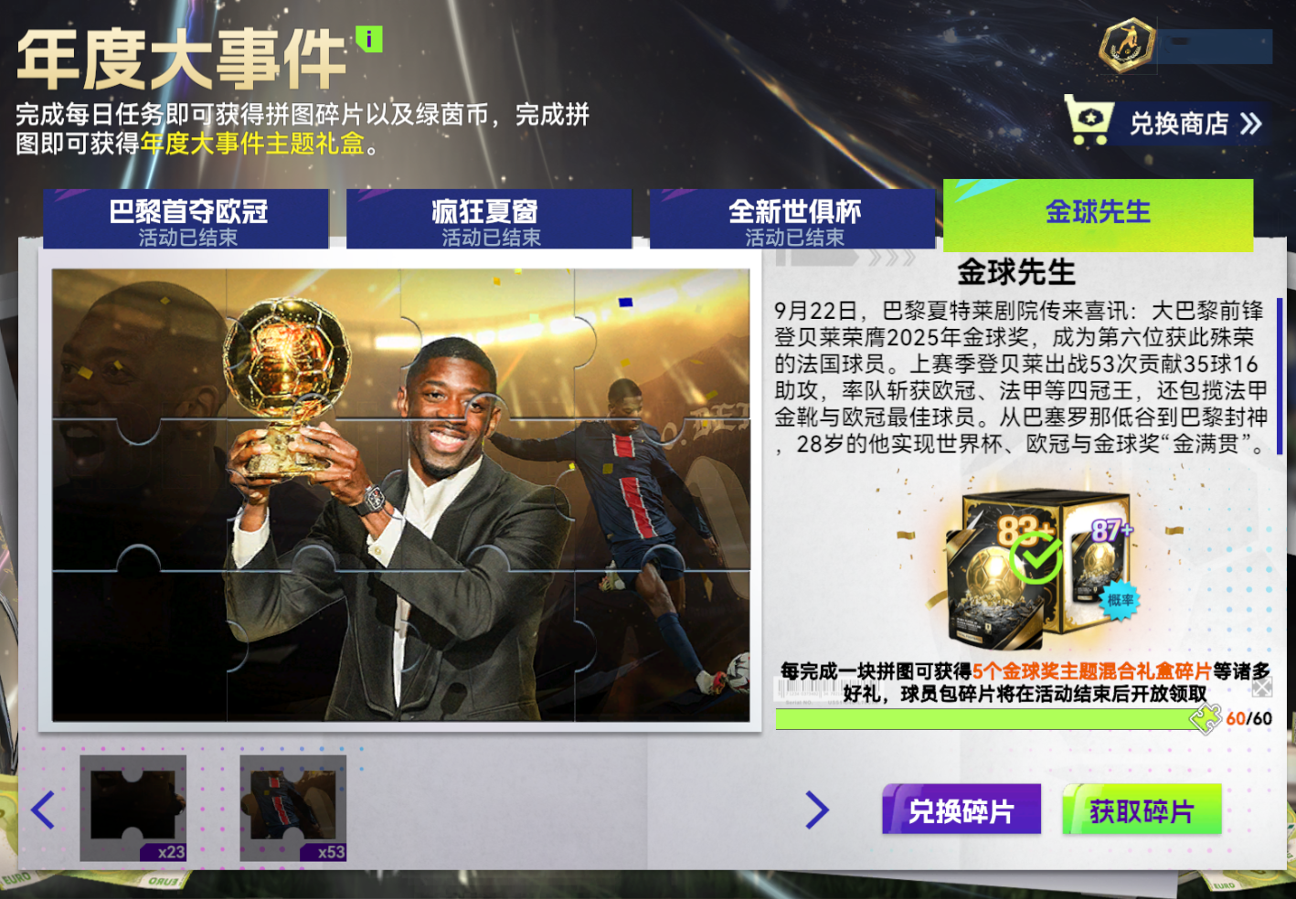 完成每日任务即可获得拼图碎片以及绿茵币,完成拼图即可获得金球奖主题混合礼盒,最高可获得【87+】球员包。2025年的金球奖属于那个完成蜕变的名字——登贝莱。他从质疑与低谷中走来,却用进球、助攻与冠军铺就封神之路。一个赛季的极致爆发,让他站上了真正的世界之巅。参与活动,拼出金球加冕的非凡时刻。让“金球先生”的光芒,照亮你的阵容!