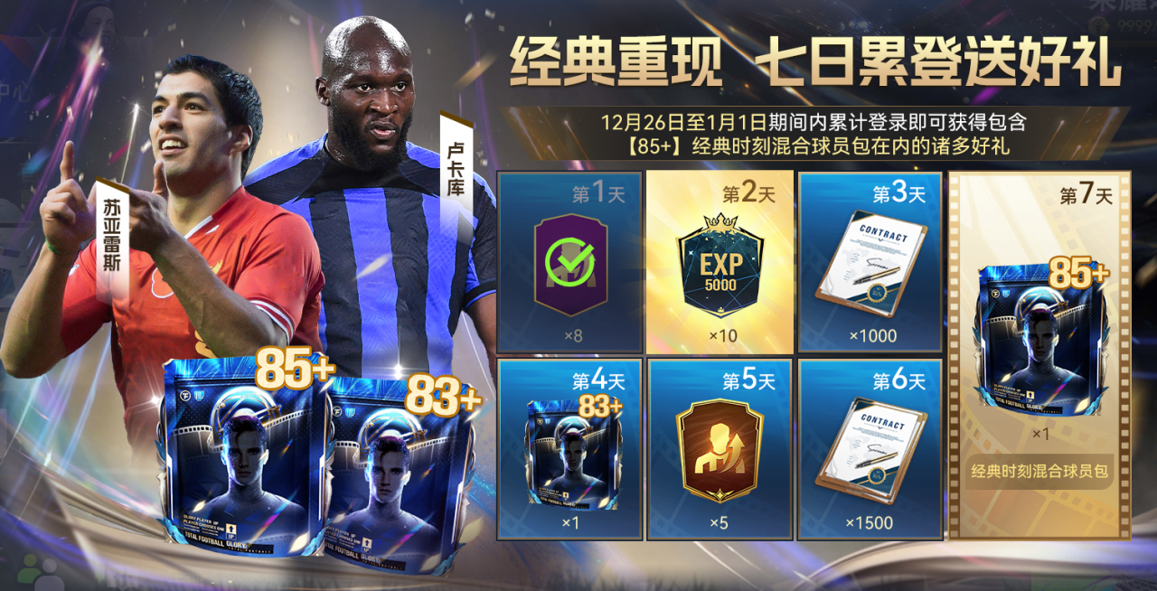 12月26日至1月1日期间累计登录即可领取包含【85+】经典时刻混合球员包在内的诸多好礼。经典时刻主题球员第二期重磅登场!连续七日登录,不只是简单的签到,更是一次与经典并肩前行的时光旅程。当熟悉的瞬间重新汇聚成阵容力量,各位主帅的球队,也将在年末迎来一次真正意义上的“经典升级”!