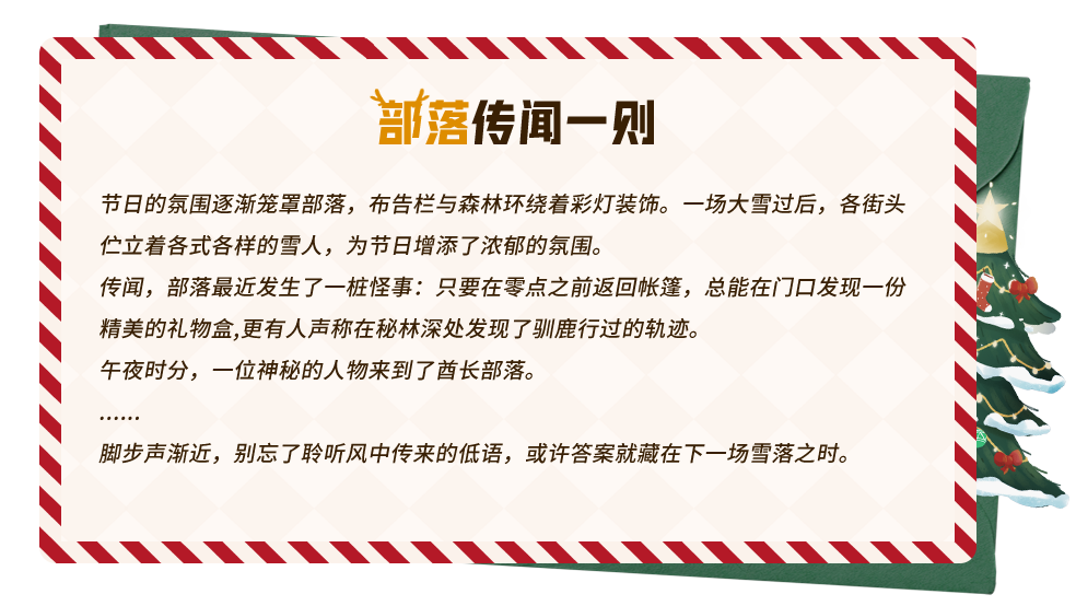 圣诞期间部落将上新雪人赠礼橱窗,礼包内含有圣诞限定头像框、槲寄生等节日道具,购买一档后即解锁下一档,最高可解锁5档礼包。