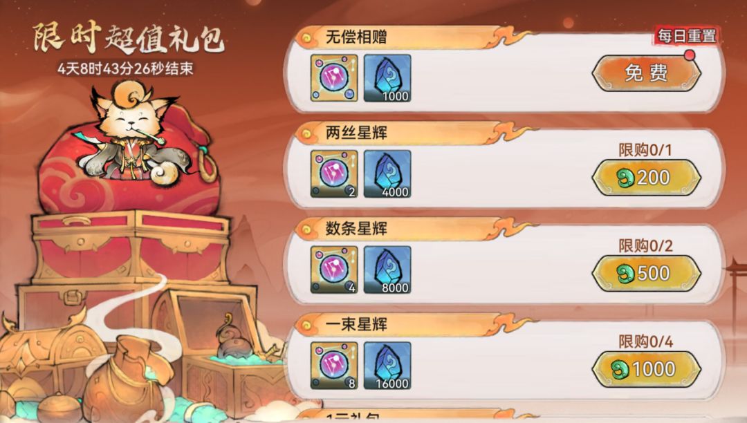 除了签到赠礼和通宝仙市活动外,祖师还可通过购买限时礼包获取星辉玉。