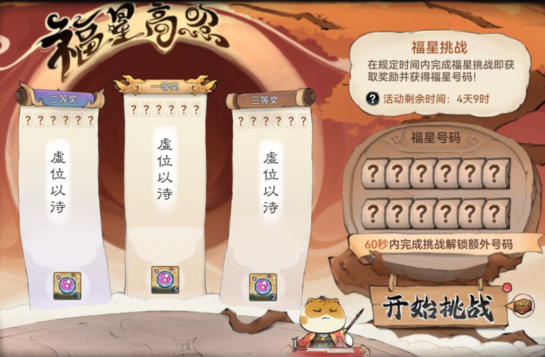 活动期间,祖师每天晚上20点前可参与小游戏挑战,获取专属福星号码来参与福星抽奖。