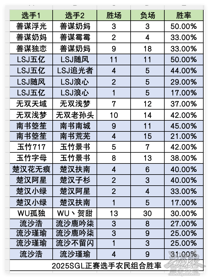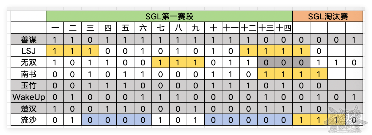 2025SGL四强队伍:LSJ,南书,无双,流沙。无双和流沙的败者确定为本年度殿军。LSJ和南书的胜者保底亚军。淘汰赛主要战况回顾: 第一轮善谋在与南书的对抗中打的保守,最终败给了主动进攻的南书。第二轮对抗流沙,BP阶段被流沙控三,首了龙凤,放了刘晔和张嫙,反手又被流沙抢抓了余下将面中龙凤最好的搭子神甘宁。在流沙的布局和引导下,善谋最终首了一个废子。以上为我个人对善谋之败的总结。