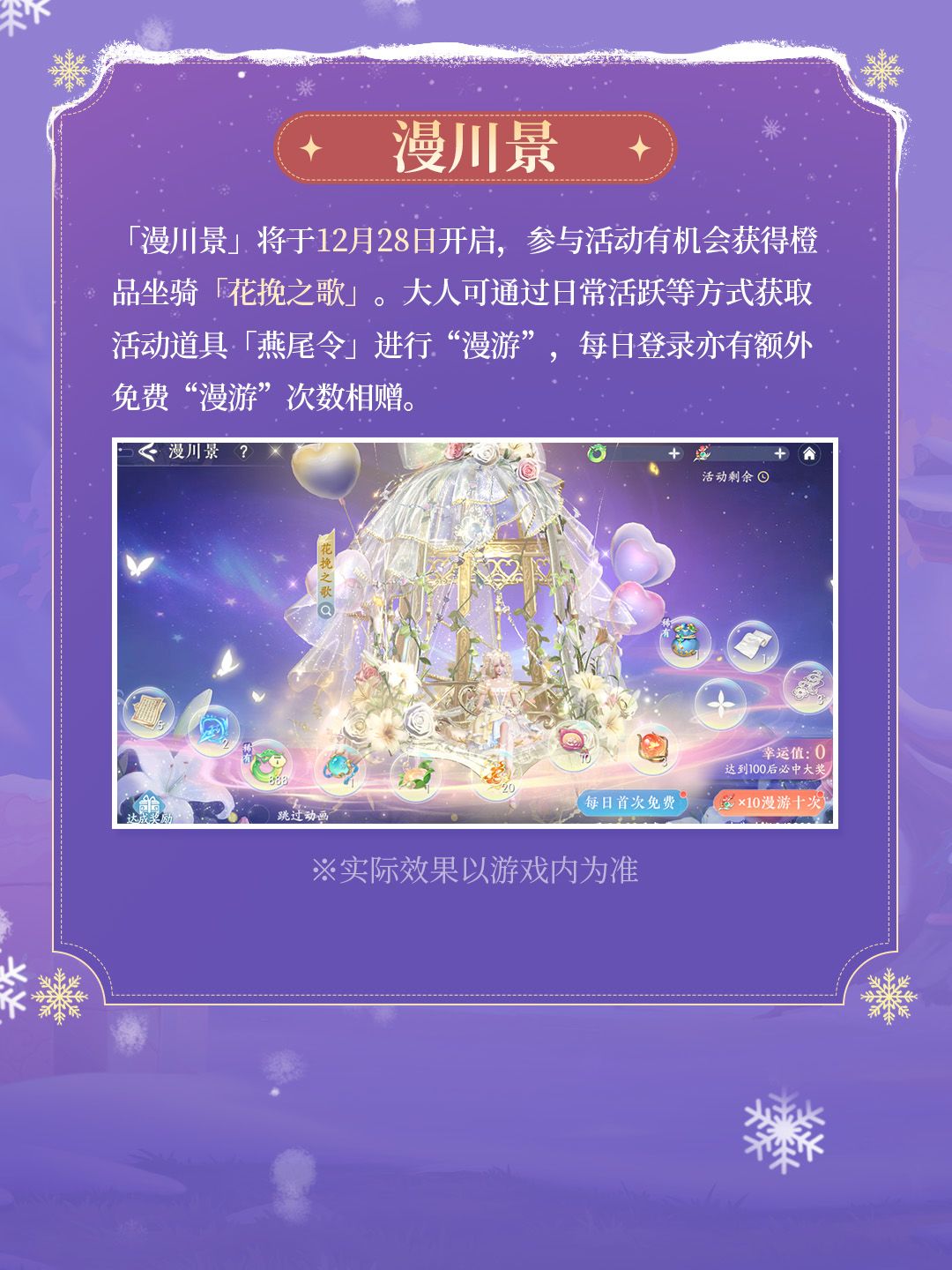 ♦「漫川景」:大人可通过日常活跃等方式获取活动道具「燕尾令」进行“漫游”,参与活动有机会获得橙品坐骑「花挽之歌」。