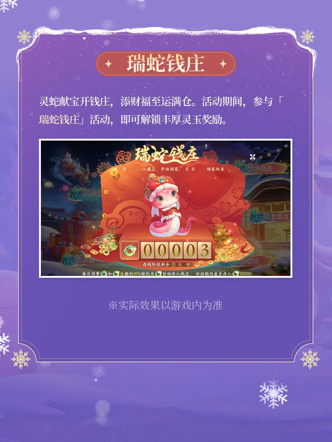 ♦「瑞蛇钱庄」:灵蛇献宝开钱庄,添财福至运满仓,参与活动,可解锁丰厚灵玉奖励。