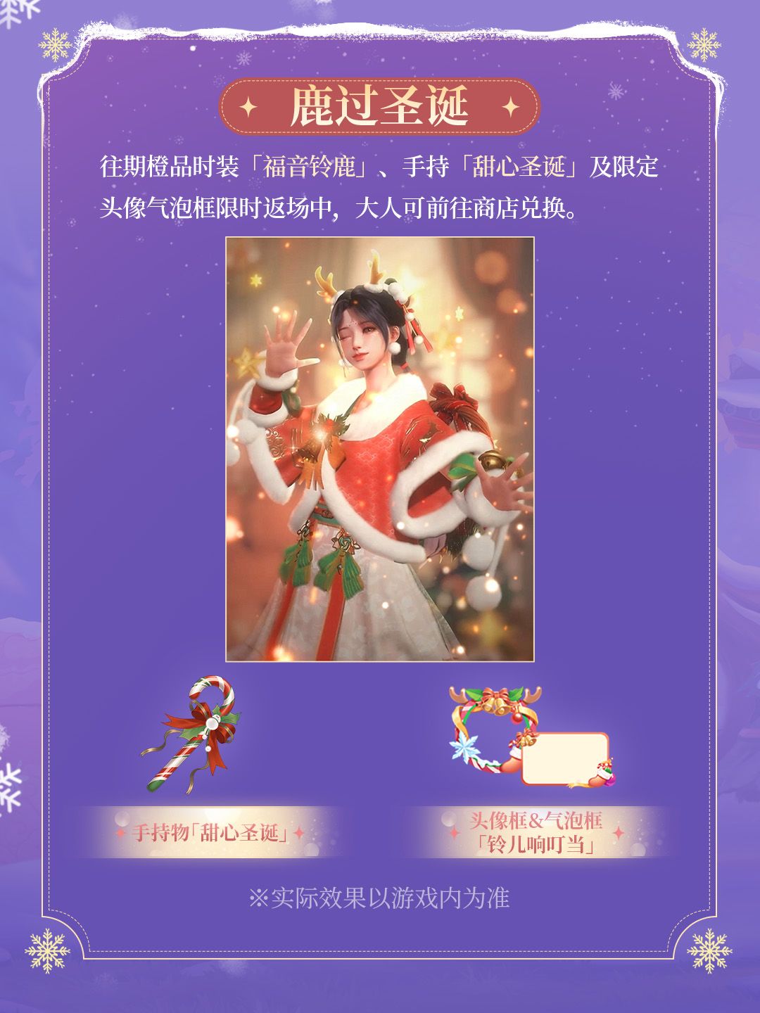 ♦「鹿过圣诞」:参与活动有机会获得限定橙品时装「甜梦圣诞」及头饰「叮叮当」,还可兑换往期圣诞精美时装。
