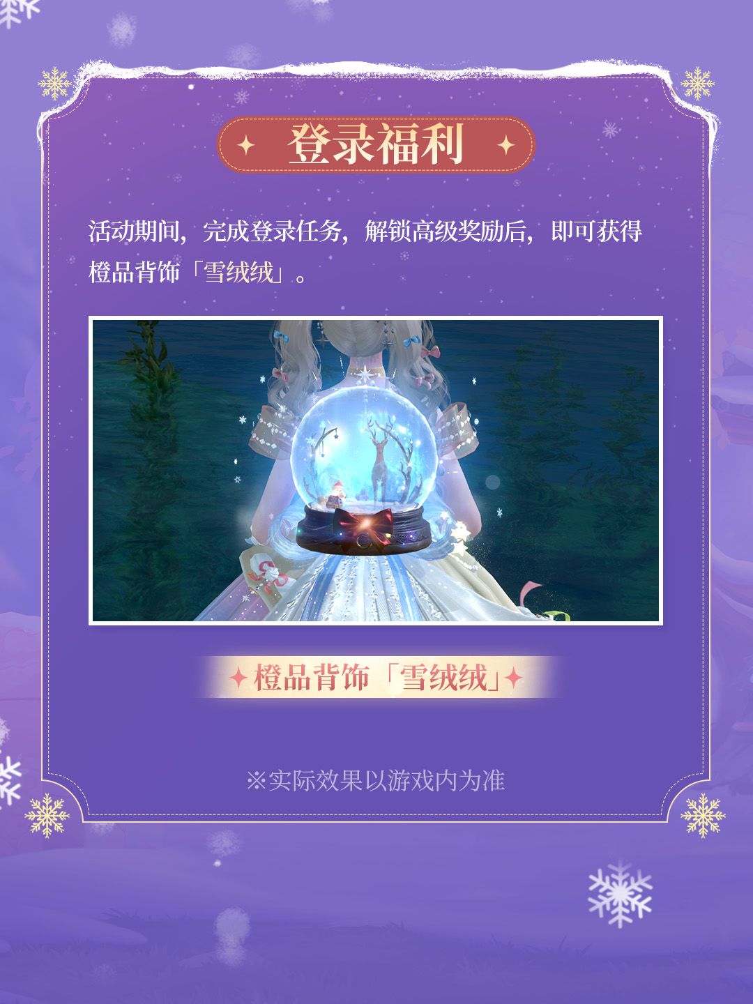 ♦「登陆福利」:完成登录任务,解锁高级奖励,可获得橙品背饰「雪绒绒」。