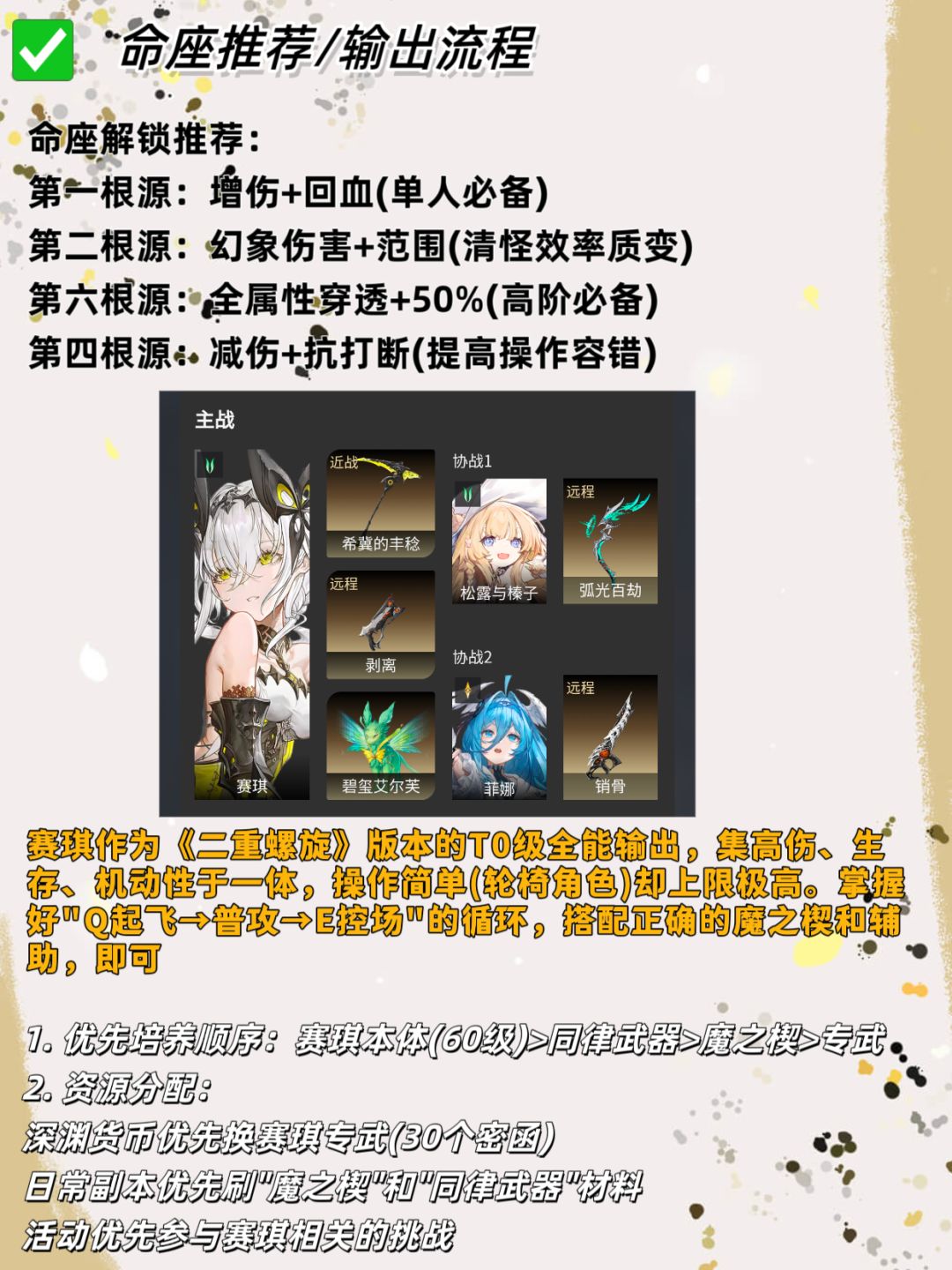 赛琪是T0级风属性输出角色,被誉为"最强轮椅",具有飞行规避伤害和高爆发两大核心优势。
