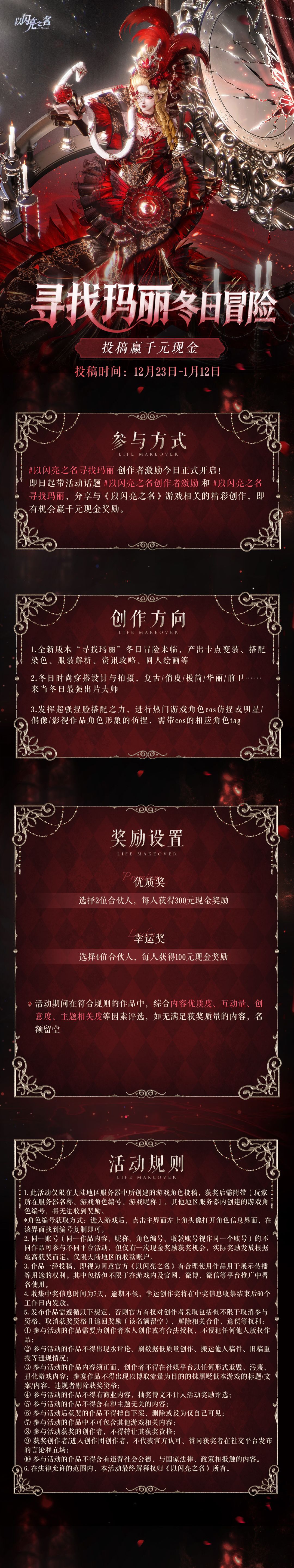 即日起带话题#以闪亮之名创作者激励 和 #以闪亮之名寻找玛丽 ,分享与《以闪亮之名》游戏最新版本相关的精彩创作,即有机会获得现金奖励。优秀作品有机会上线《以闪亮之名》官网展示,成为万千玩家追捧的闪亮之作!优秀创作者还有机会加入官方创作团,参与专属创作活动,获得更多流量扶持!