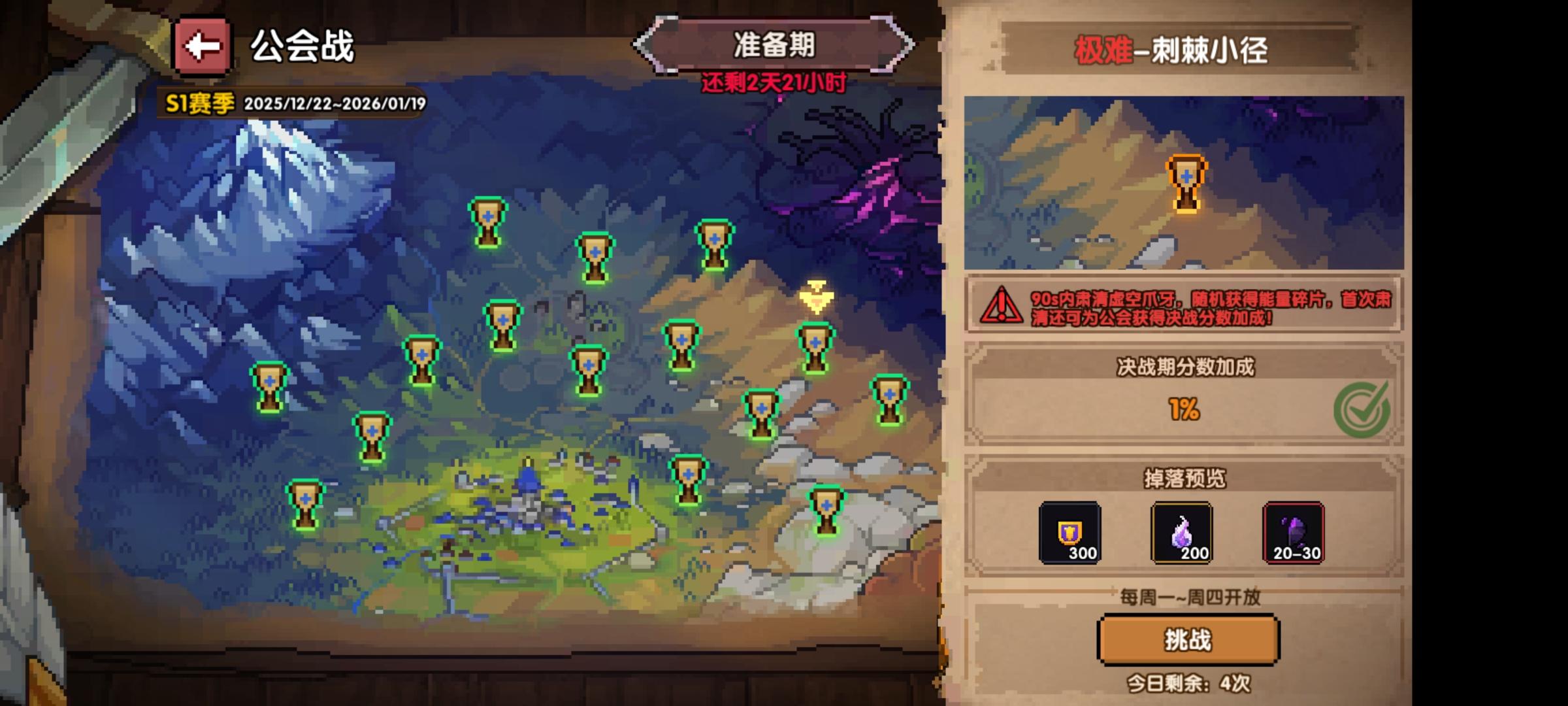 有难度分布的难度越高掉落就越好,建议就是把所有的图开完之后就一直打最高的极难难度,来获得能量碎片和公会贡献。一天会获得两次挑战机会(可以累积,最高8次也就正好一周的)