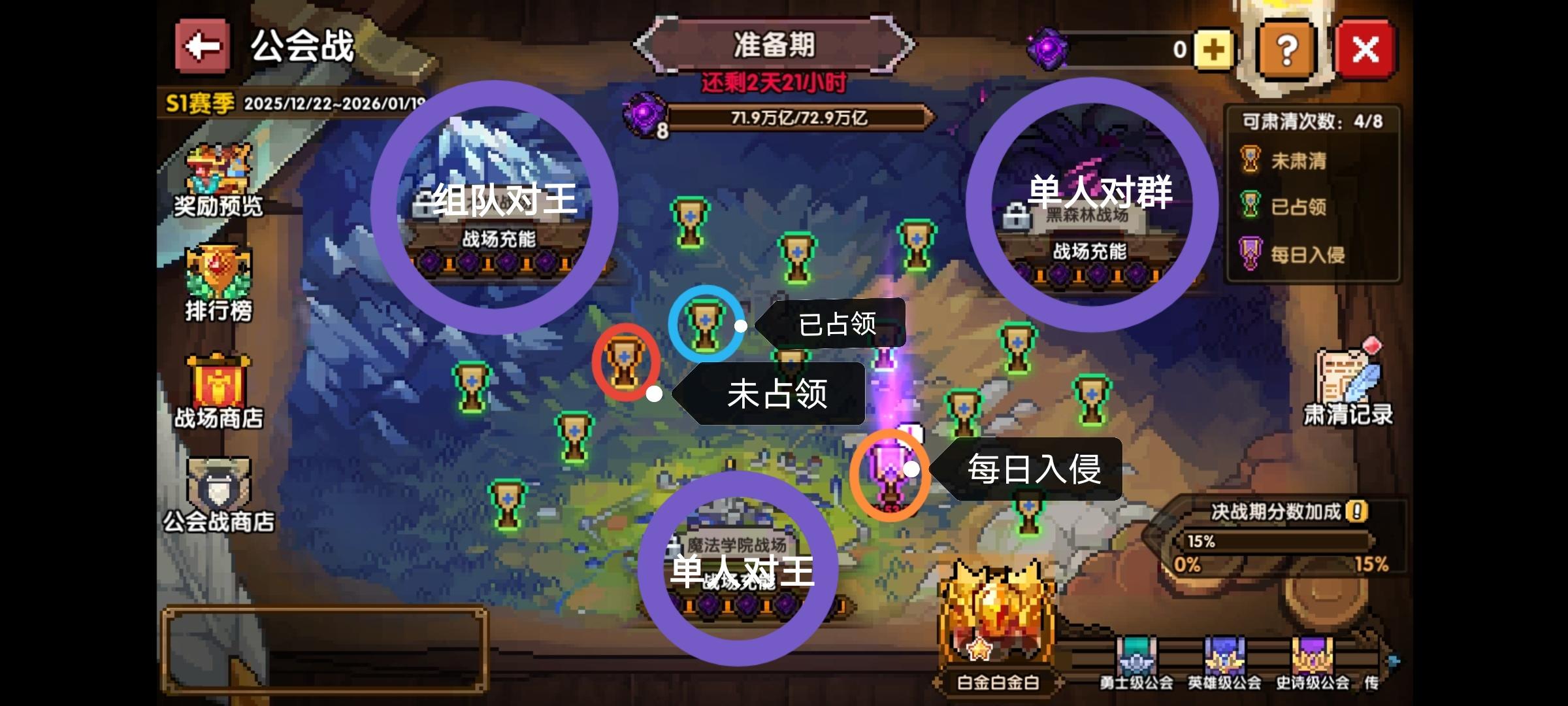 决战期则是打那三个战场,左上角的北境是组队对王,下面的魔法学院是单人对王,右上角的黑暗森林是单人对群。就是打伤害得分数,打死会重置并翻倍(翻3倍)血量(每次重置会爆一个功勋宝箱,是开出来代币的),但是它的属性不会变,可以认为和上面的入侵是一样,在一定的时间内打然后达到一定的阈值来获得一定的分数,人物但不要轻易死,死了虽然不会退出副本但是会有debuff(负面buff)而且boss的伤害很高,和世界boss一样,打的是生命值百分比(战士的半血套可以不会来了)。