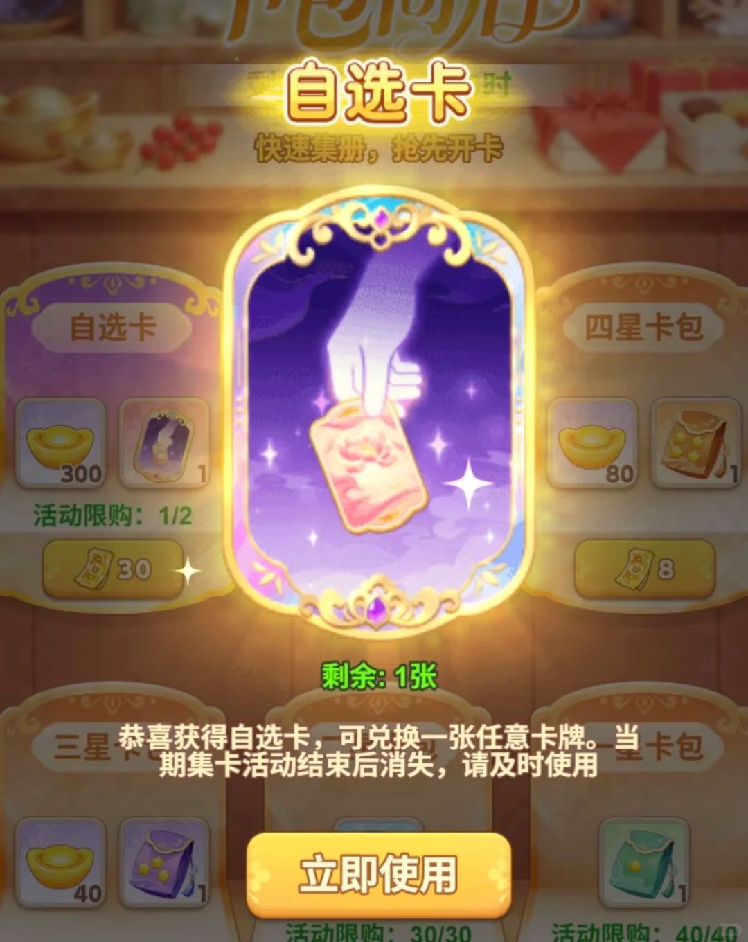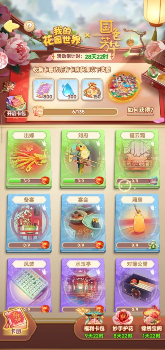 再说说大家最关心的集卡和福利吧,这部分我踩了几个小坑,给大家提个醒。联动的核心玩法之一就是集卡册,一共15页,集齐了能拿终极鲜花大奖,也就是真实花束礼盒!卡包的获取方式还挺多的,消耗元宝、看视频都能拿,每天还有限购的日常卡包,3米就能换三星卡,6米换四星卡,赶进度的姐妹可以入,性价比还不错。我刚开始不知道重复的卡牌能兑换,攒了一堆重复的三星卡放着,后来才发现能直接换成自己缺的卡,真的白浪费了好几天进度,这点大家一定要注意!还有个隐藏小技巧要分享,卡册第九页藏着“火药金丹,对簿公堂”的特殊任务,厢房里还有茶册相关的隐藏任务,多点点探索就能解锁,能拿到额外的奖励。