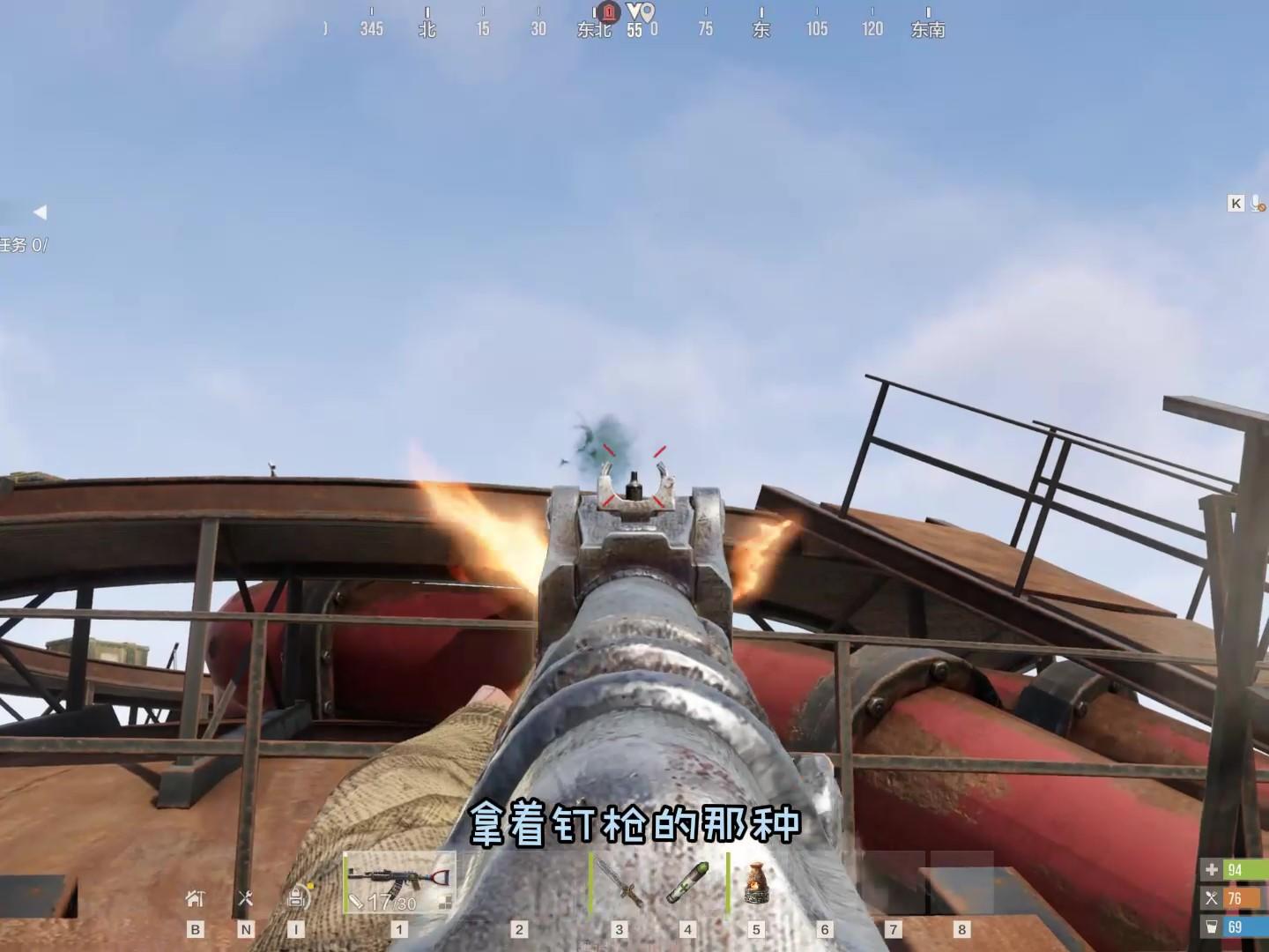 然后咱们继续往顶楼走,这里会刷新两个小卡拉米,拿着钉枪的那种,直接做掉,吃我们的板条箱。