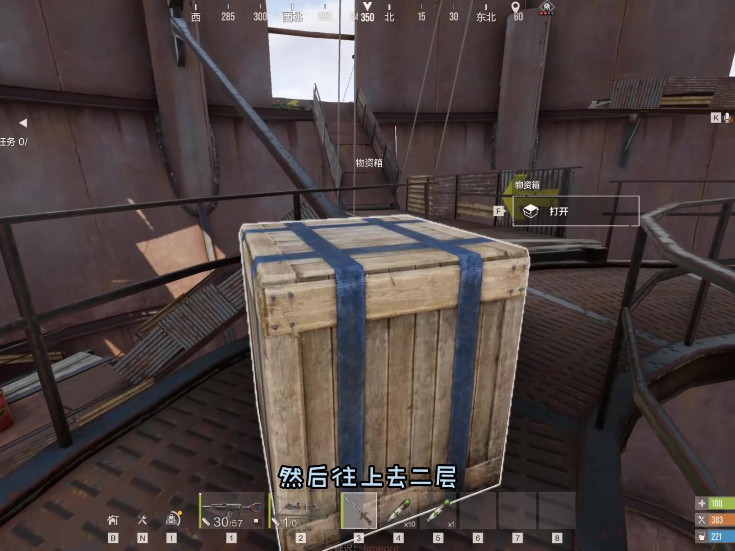 继续跟着箭头走,往上走上三层会刷新很多物资箱,然后多沿着四周往外边看看,概率刷新板条箱,这位置很有说法要小心!