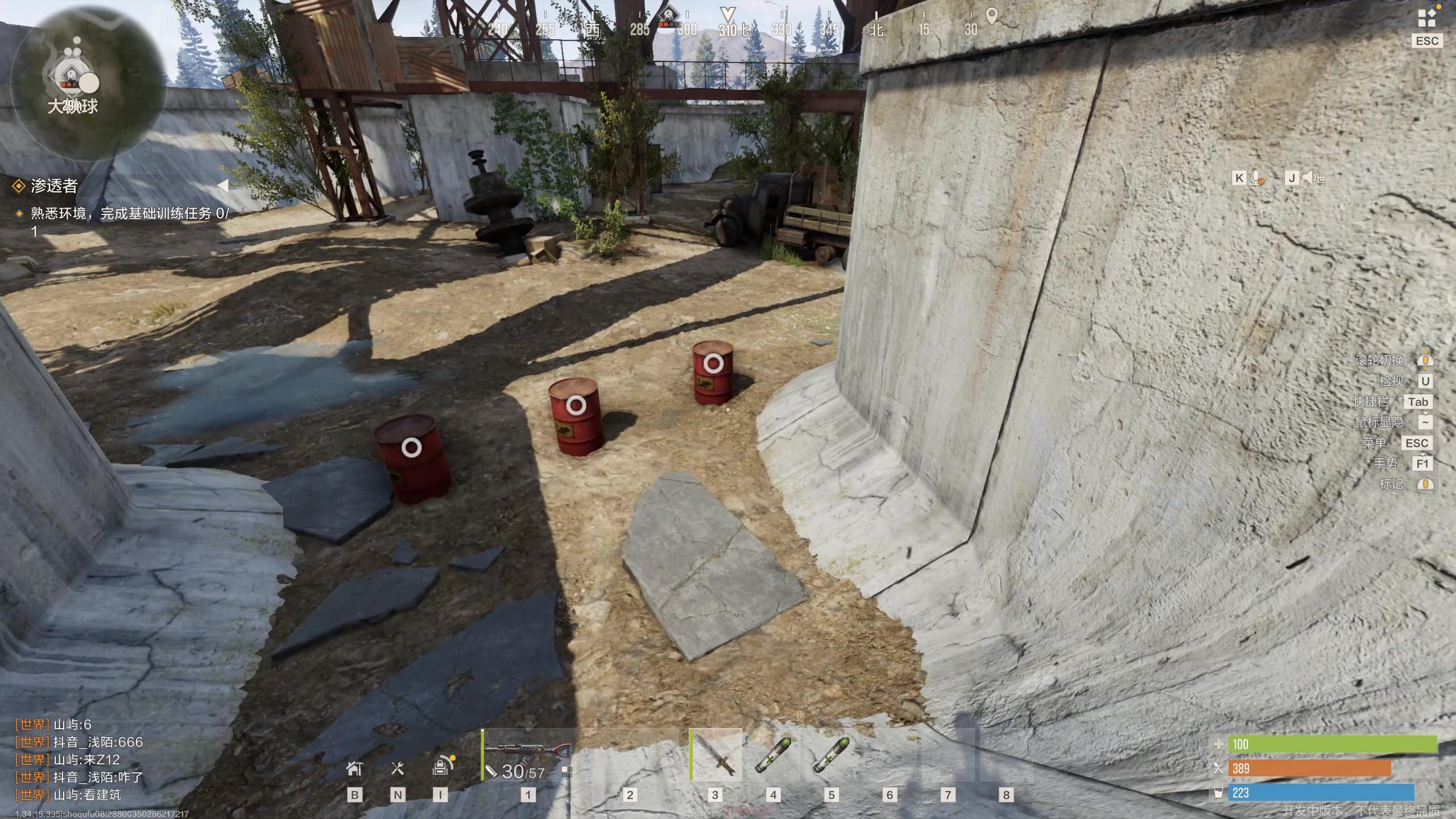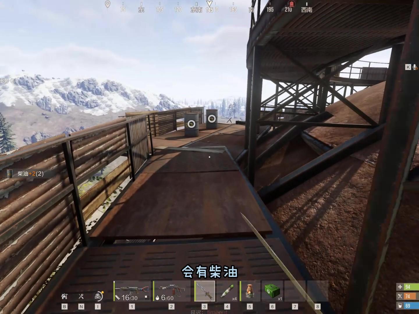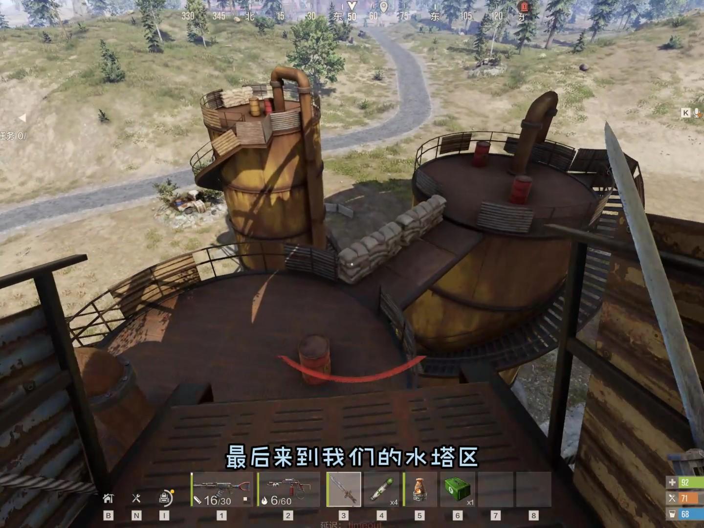 然后走钢丝,往下跳,来到我们的水塔区,水塔上有很多红油桶。