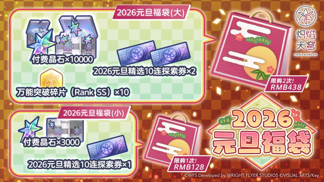 ●大福袋可购买2次,福袋内容为「付费晶石×10000」、「万能风格碎片(Rank SS)×10」、「2026元旦精选10连探索券×2」。