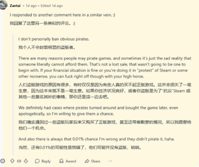 该内容被转发至Reddit社区后迅速发酵,Zantai进一步解释,游戏目前为Steam平台独占,根本不存在非Steam版本,玩家提及的版本实质就是盗版,他明确表态不支持开发者的人,没资格参与社区讨论,呼吁玩家珍惜独立开发者心血,若作品带来快乐便要给予支持,买不起也不该公然吐槽。