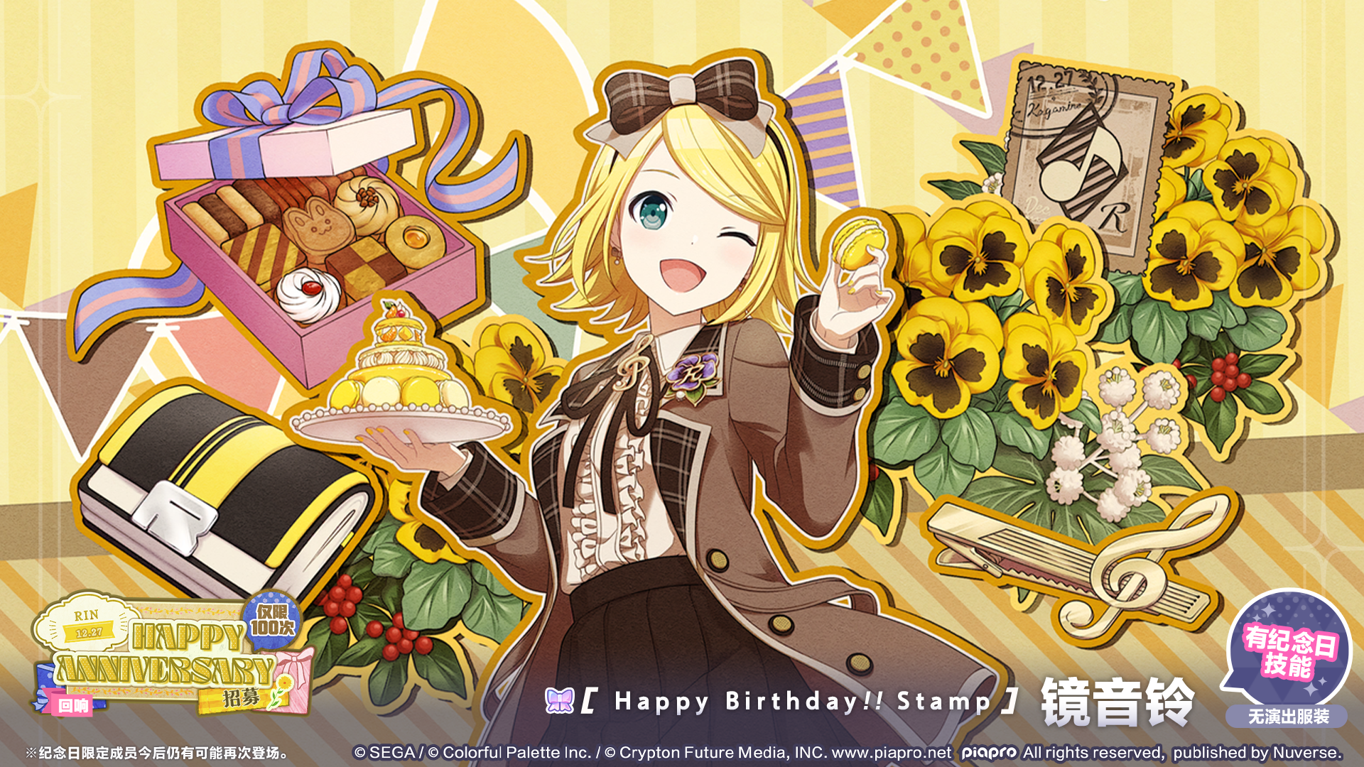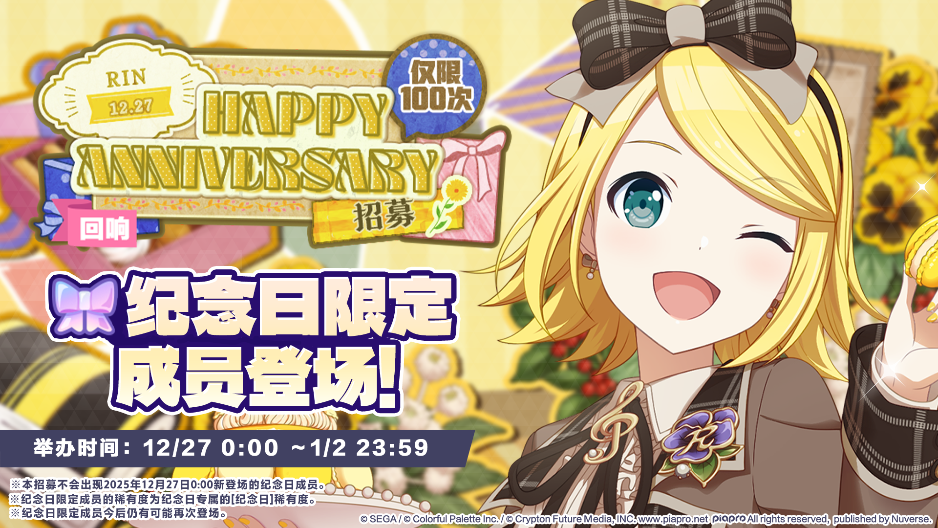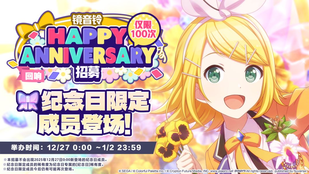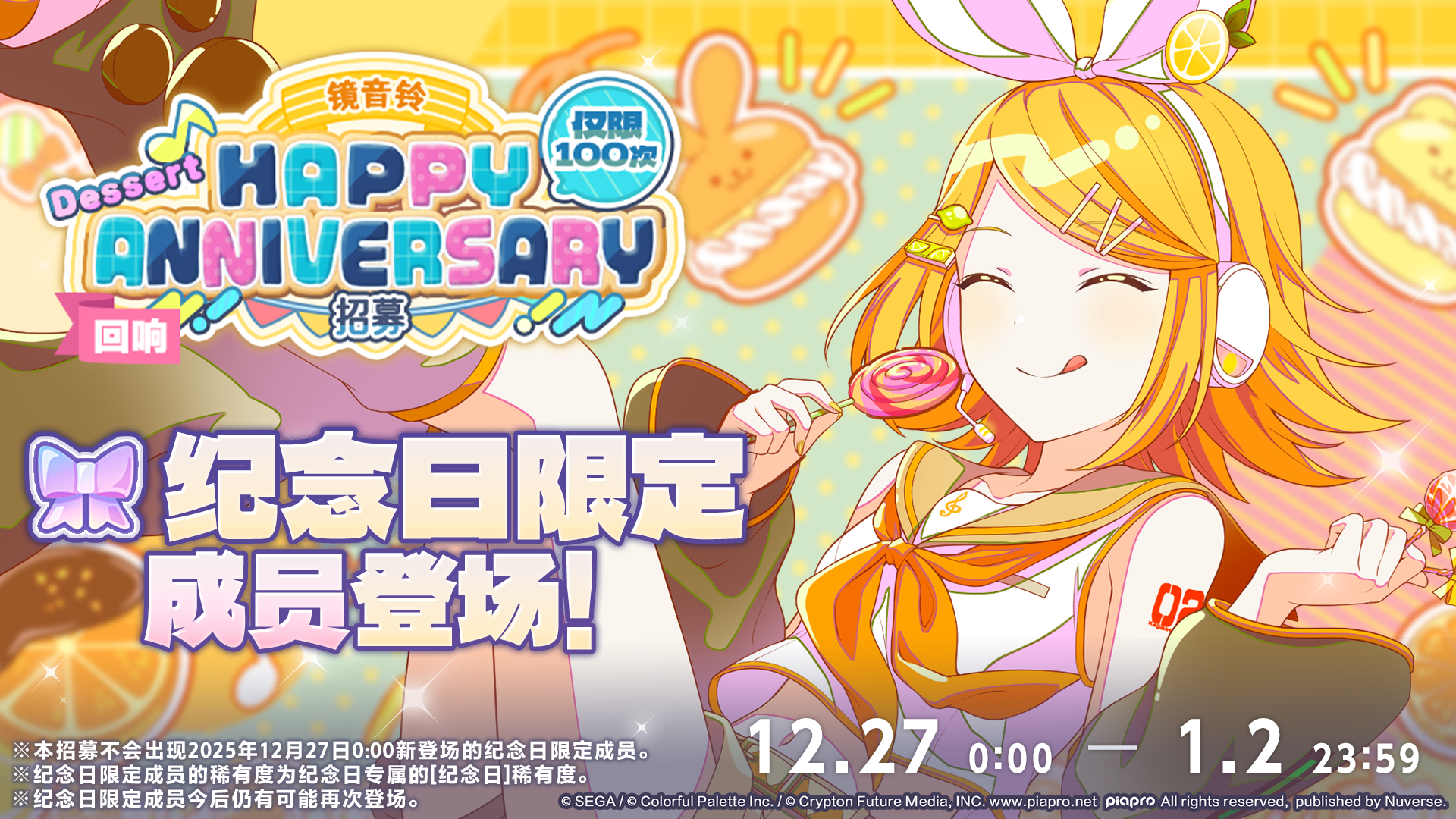 12/27 00:00起将举办「[镜音铃] HAPPY ANNIVERSARY 2025 招募」、「[回响][镜音铃] HAPPY ANNIVERSARY Dessert 招募」、「[回响][镜音铃] HAPPY ANNIVERSARY Stamp 招募」、「[回响][镜音铃] HAPPY ANNIVERSARY Flower招募」🎉
