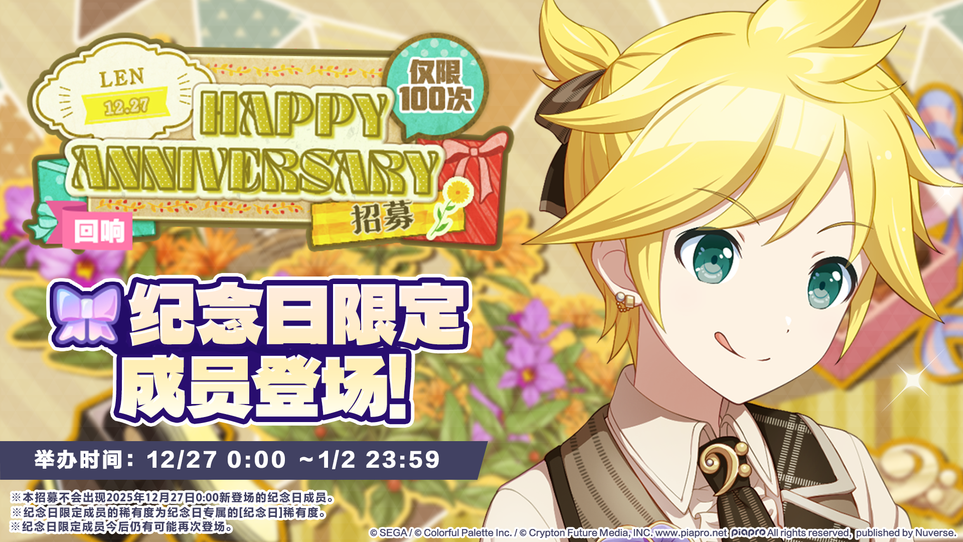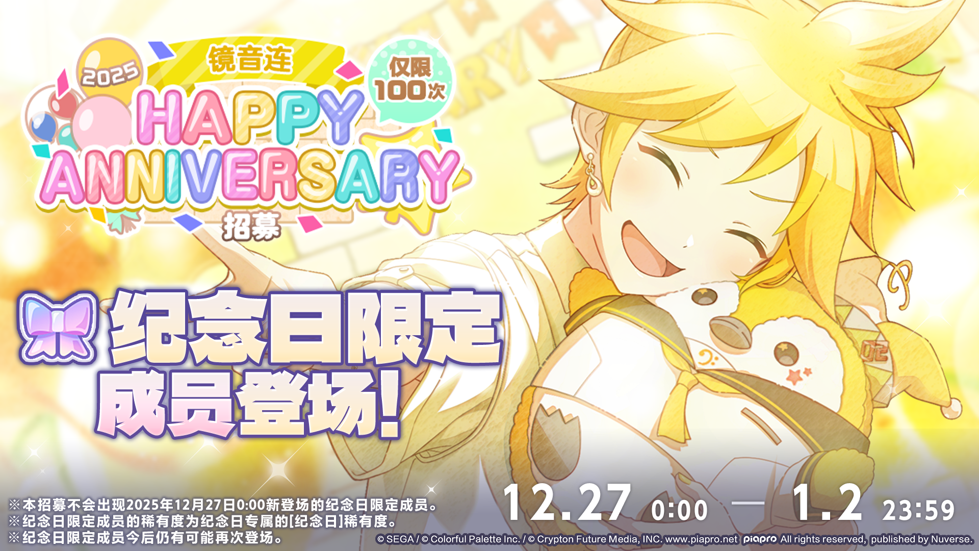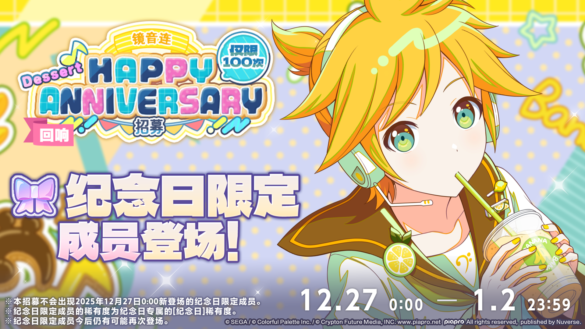 12/27 00:00起将举办「[镜音连] HAPPY ANNIVERSARY 2025 招募」、「[回响][镜音连] HAPPY ANNIVERSARY Dessert 招募」、「[回响][镜音连] HAPPY ANNIVERSARY Stamp 招募」、「[回响][镜音连] HAPPY ANNIVERSARY Flower招募」🎉