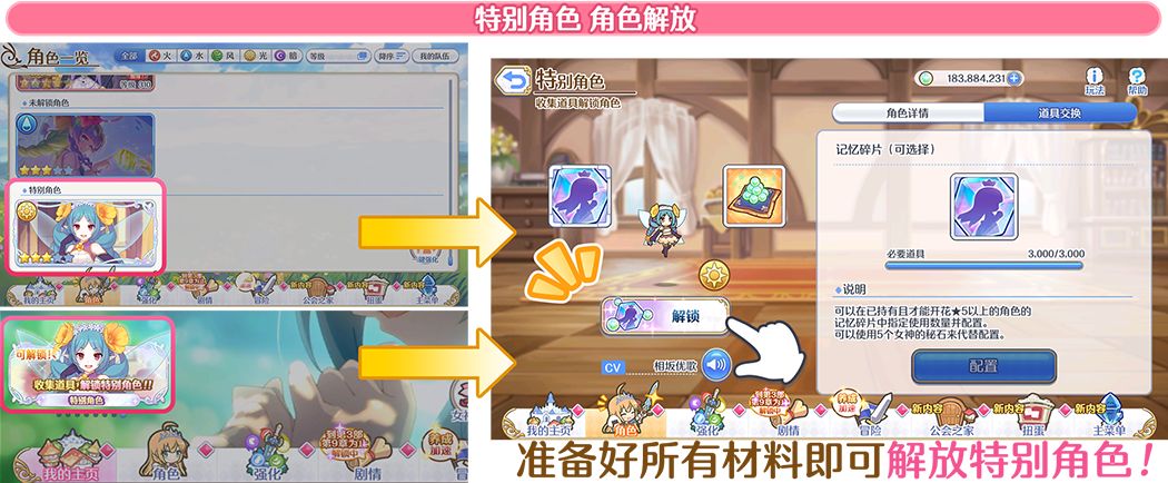 通过选择「角色一览」的「特别角色」或是主页面的小Banner即可移动至特别角色的解锁界面。