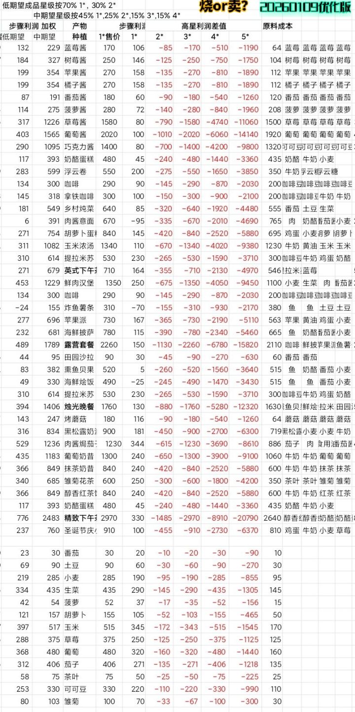 结语:虽然本文计算的是逐利的,但游戏还是要玩得开心的。如果觉得每次做菜前这么算很累的话,还不如就按照“1*留着做菜 高星直接卖掉”呢!