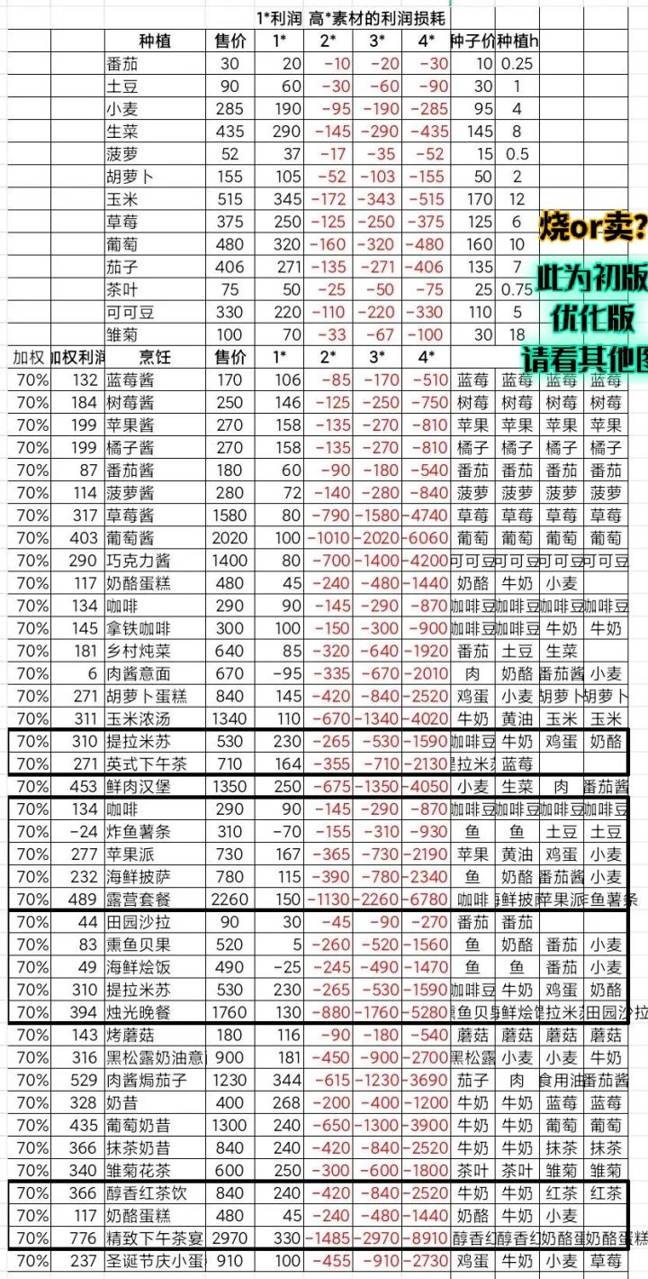 2.利润计算时,成本采用的是原料的售出价,而非种子或最基础材料价。这样的利润含义,代表了本次烹饪/加工所产生的增值收益,不代表从头种植再加工出这个成品的总利润。