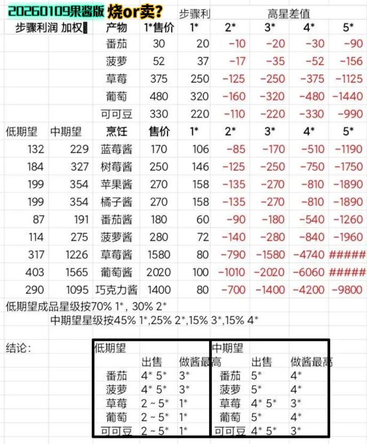做番茄酱,番茄用了2个2*、1个4*、还有个1*,则实际步骤利润为60-10-10-30=10,是正的,可以烧。如果是负的,就卖掉或者先囤仓库。