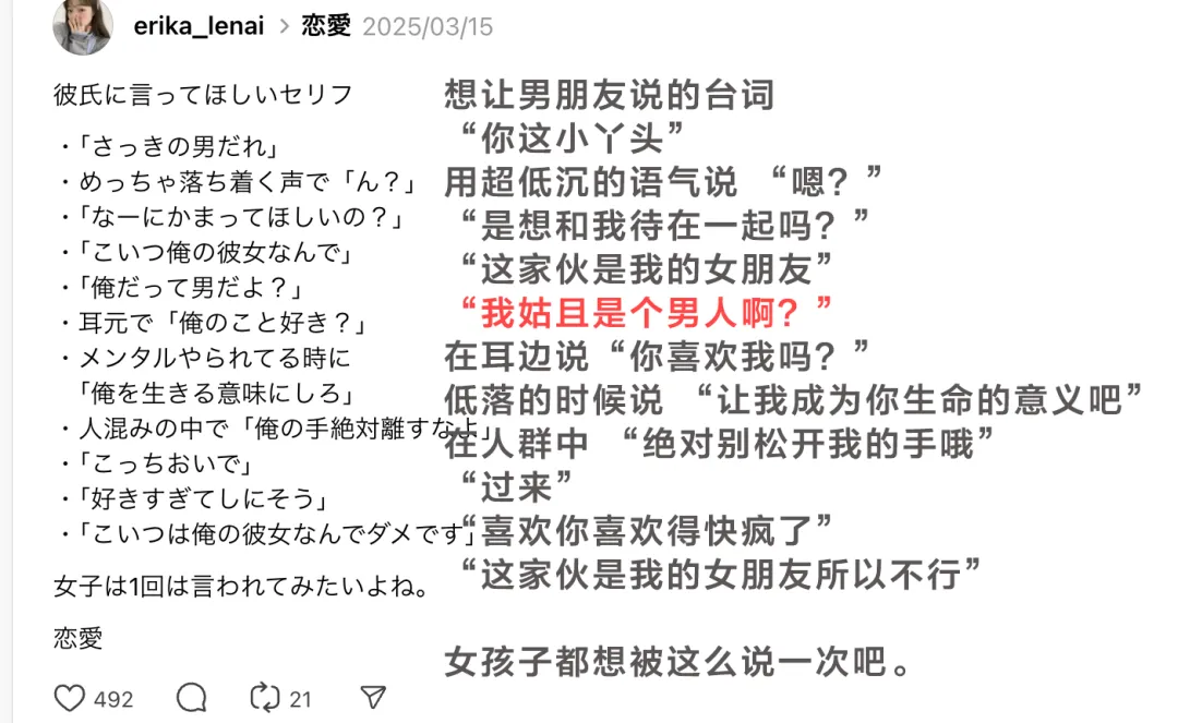这可能源于文化语境对这类文案的接受度更高——和那边之前流行的草食系肉食系断食系绝食系男子一个意思,他们常在恋爱关系中强调“男子力”的重要性。