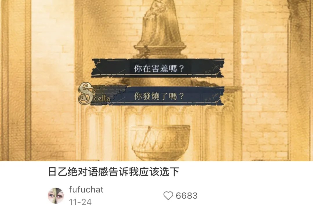顺带一提,这导致了很多玩家被锻炼出了条件反射,如下图面对男主的悸动,选天然呆的“你发烧了吗”会比主动进攻的“你在害羞吗”更安全......