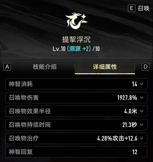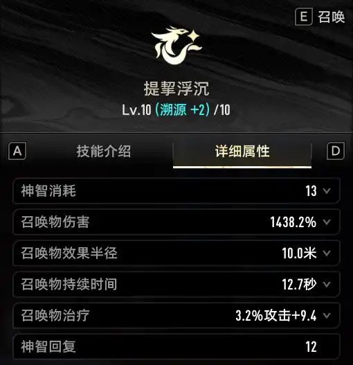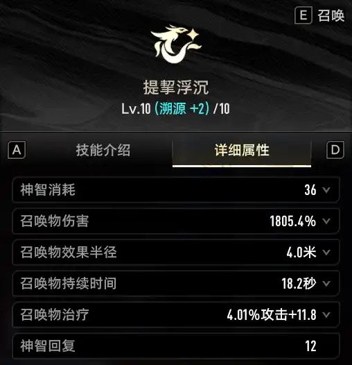 召唤类型技能,[召唤物·云螭]每秒会对周围至多5名敌人造成伤害,但是伤害表现很差,每隔三秒会对周围队友提供血量治疗并回复神智。[召唤物·云螭]的伤害、治疗、神智回复频率不受[巨鲸之水雾弥散]影响,且生命、神智回复效果不受技能范围影响,生命、神智恢复效果和[召唤物·云螭]的第三次攻击同频,因此战技持续时间内,固定第三秒回复一次神智,需要技能持续时间需要略微大于3秒的倍数。