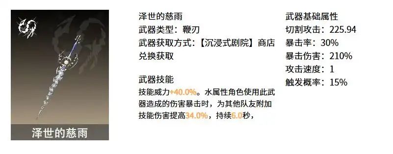 「泽世的慈雨」的武器效果对于暴击率有比较高的需求,结合武器自身高白值的特点,推荐魔之楔属性搭配方面,优先暴击率、其次暴击伤害、攻击力、切割攻击。