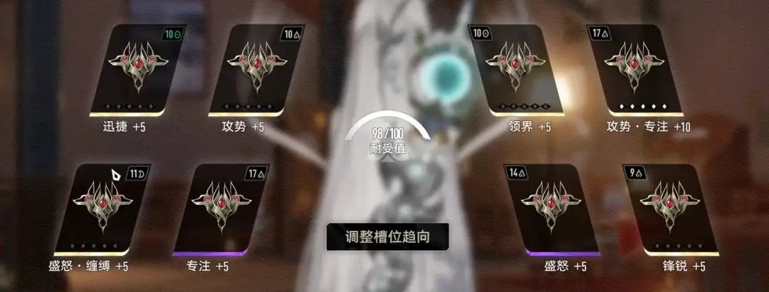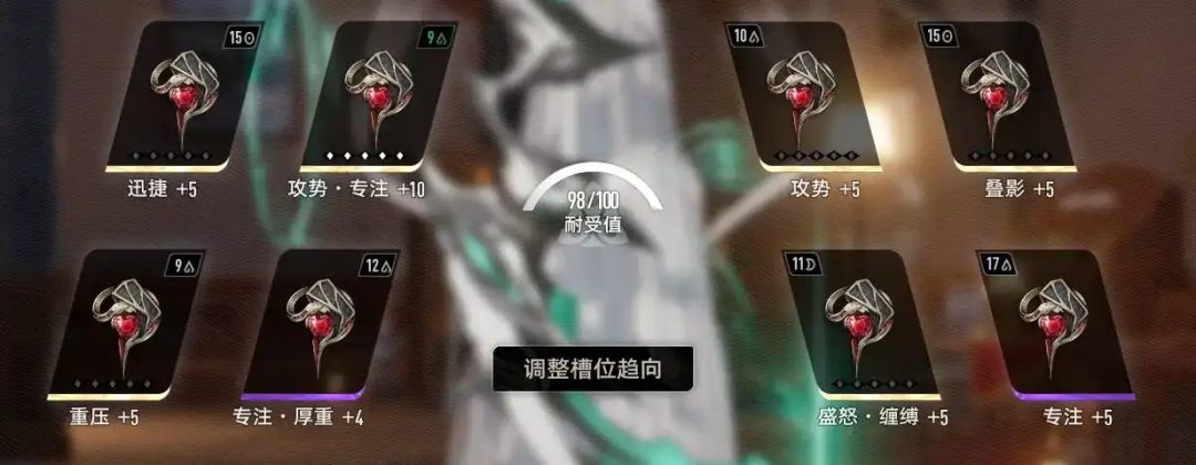 弧光百劫的技能同样需要暴击率,因此暴击率优先,携带满级【夜魔之攻势·专注】的情况下,可以搭配一个4级的【夜魔之专注·厚重】,可以达到99.58%的暴击率,其他魔之楔选择暴击伤害、攻击力、震荡攻击即可。