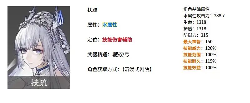 「扶疏」是一个战技可以给队友提供生命、神智回复爆发技可以给队友提供攻击速度、技能威力被动技能给队友提供技能速度、技能伤害的辅助角色。她本身的伤害表现较差,因此推荐作为技能伤害辅助角色来培养,配合【塔比瑟】可以组成目前比较通用的技能伤害辅助组合,整体的辅助能力非常出众。