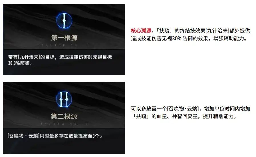 「扶疏」主要以辅助身份出现,往往选择交给AI操刀,充当协战角色,在非战斗状态,AI的技能释放逻辑会建立在主操角色的神智是否消耗上,主操角色消耗一定百分比的神智之后,AI的「扶疏」会连续释放战技直至召唤物数量上限,不过如果在战斗状态,一旦索敌怪物不在召唤物攻击范围内,就会重新释放战技。如果手动操作「扶疏」的话,就没有太多需要注意的了,释放三次战技,然后释放爆发技即可。