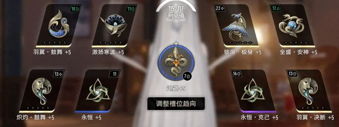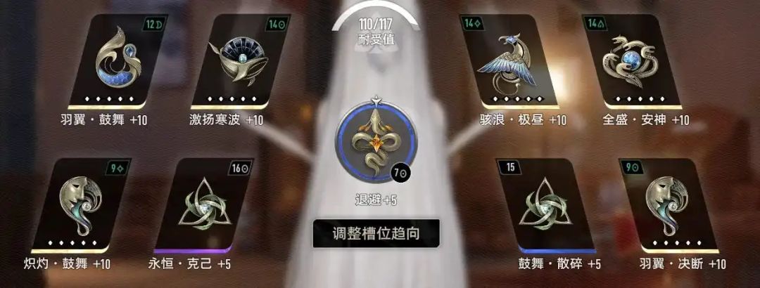 这套魔之楔的武器选择了双技能耐久的搭配,+10的【巨鲸之激扬寒波】在角色攻击达到1315的时候,可以达到增益阈值,携带+10【狮鹫之骇浪·极昼】、+10【百首之全盛·安神】、+10【契约者之炽灼·鼓舞】这三个魔之楔时,攻击力可以达到1313,基本可以吃满【巨鲸之激扬寒波】的效果,在这个基础上,携带一个+10【契约者之羽翼·决断】,技能威力可以达到252%,配合被动,可以在实战中获得100%技能威力,接近12级战技的360%的技能威力的阈值,剩下三个魔之楔可以在技能耐久、技能效益、【人面狮之乘势】中进行选择,这里推荐的魔之楔搭配可以让战技神智消耗降低至14点,持续时间超过21秒,可以回复7*12=84点神智,达到综合收益的最高点。