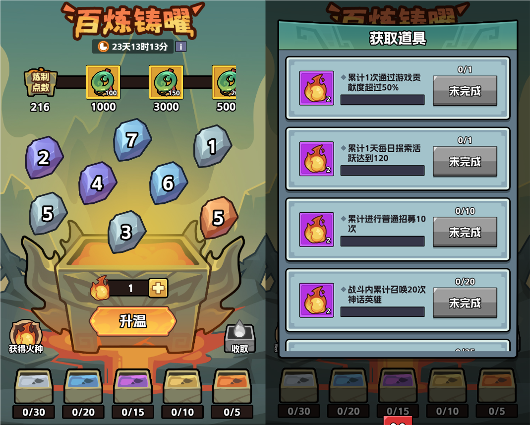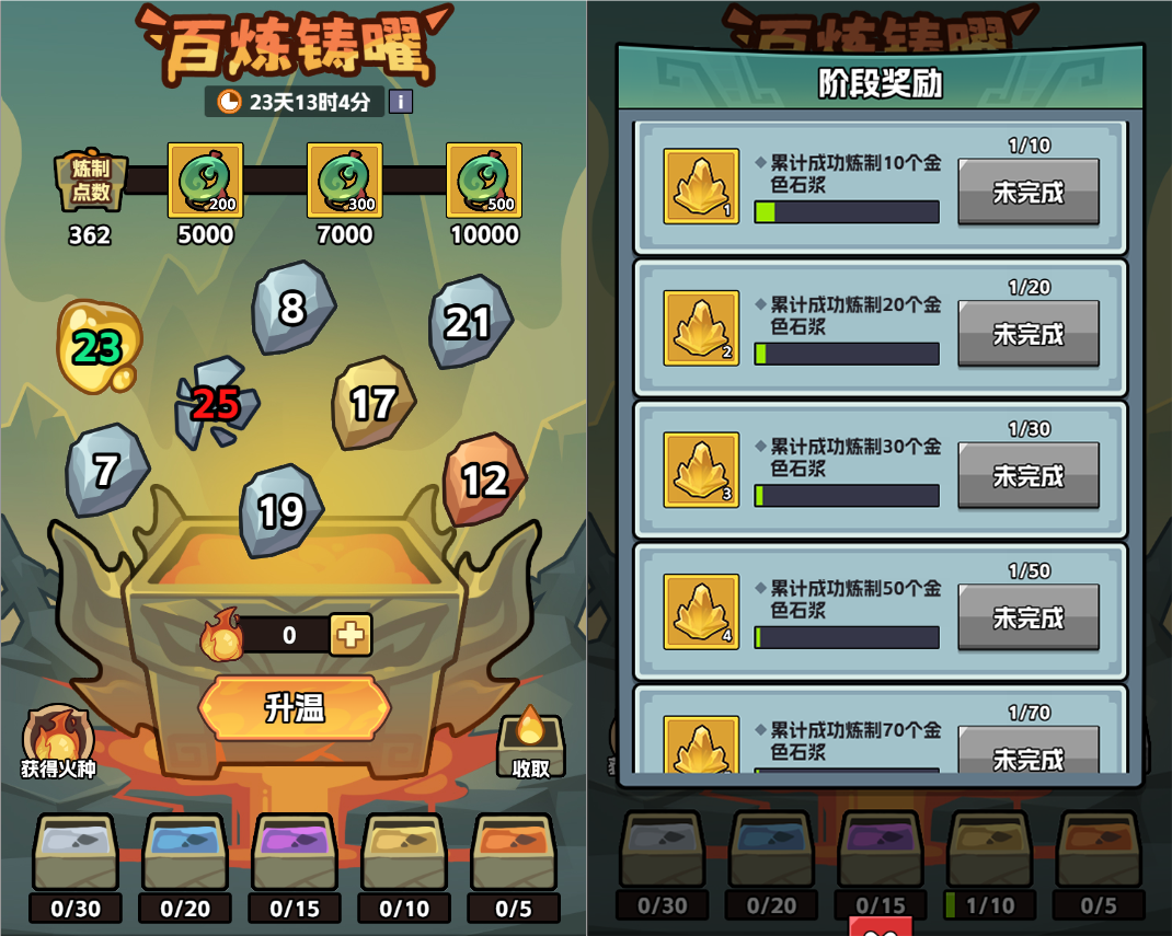 每局至少点击3次升温按钮,可点击收取按钮,获得当前未碎裂的五彩石/石浆内的炼制点数,并获得石浆对应品质的累积进度奖励-“玉璧”。玩家也可以不收取,继续升温,挑战更高的积分收益。
