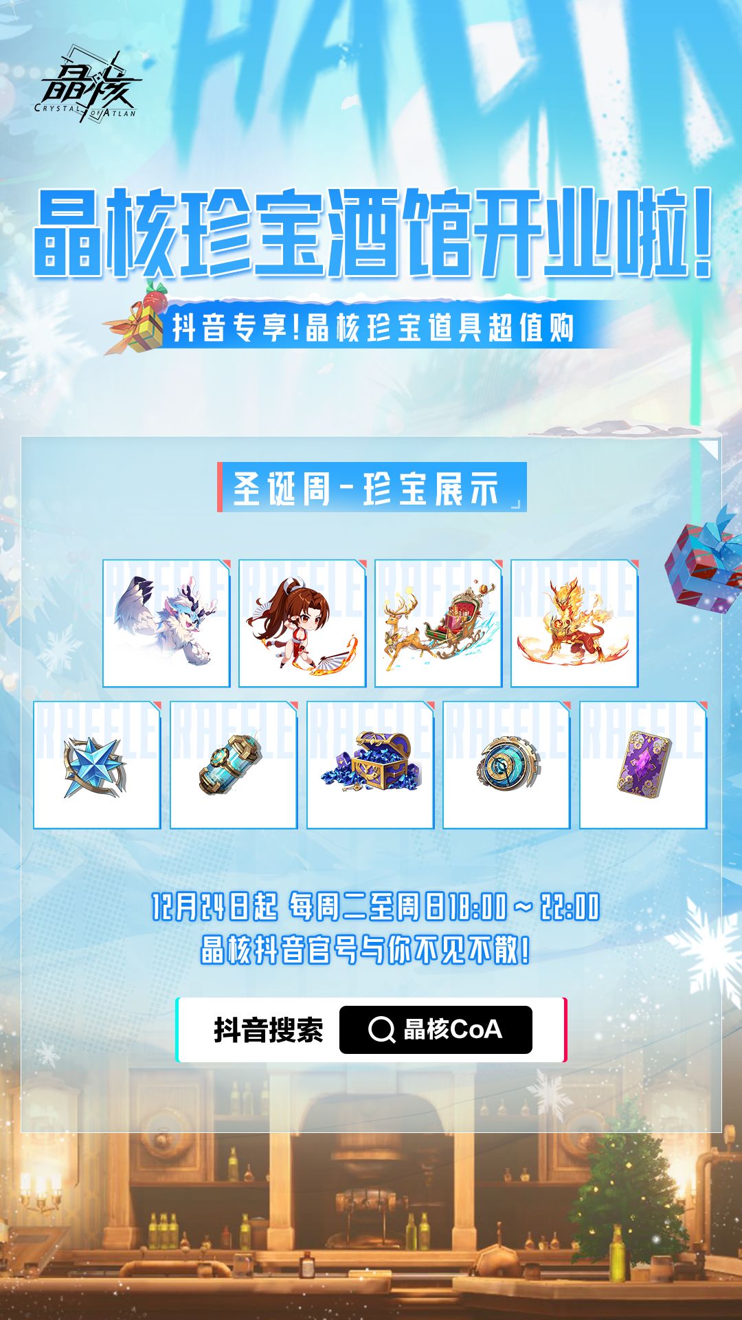 自12月24日起,锁定晶核抖音直播间,每周二至周日晚18:00-22:00,为大家带来珍品好物与超值福利~