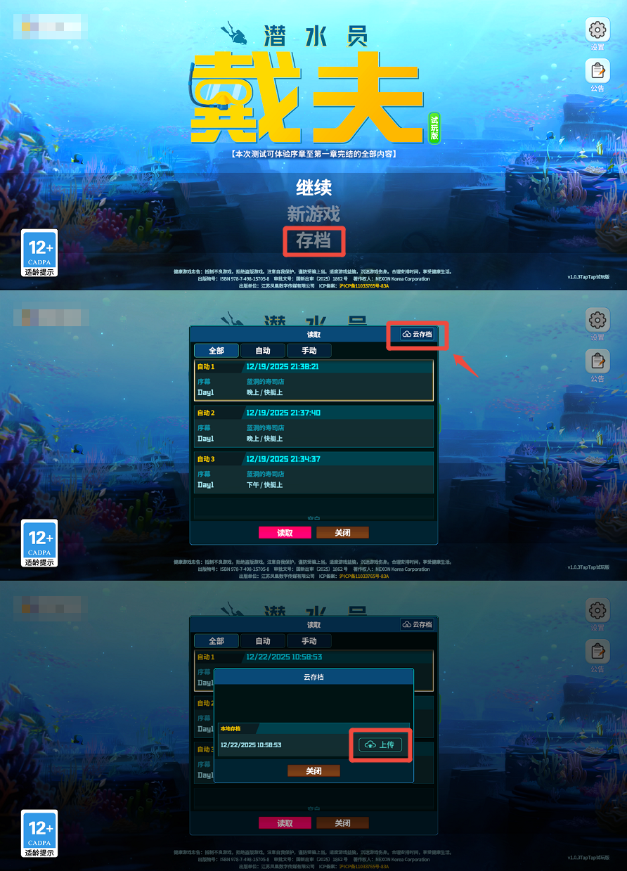 未来在正式版时,大家只需在登录后,继续通过【存档】-右上角【云存档】-【下载】按钮,获取所有云端的存档。