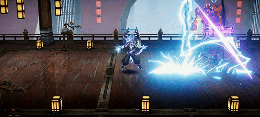 一身黑紫配色的服饰,搭配银灰机甲风装饰,头发和武器都缠绕着幽蓝色火焰特效,手持一杆流光质感的长柄武器,战斗中会手持幽蓝火焰缠绕的长柄武器,招式带着炫酷的能量特效。