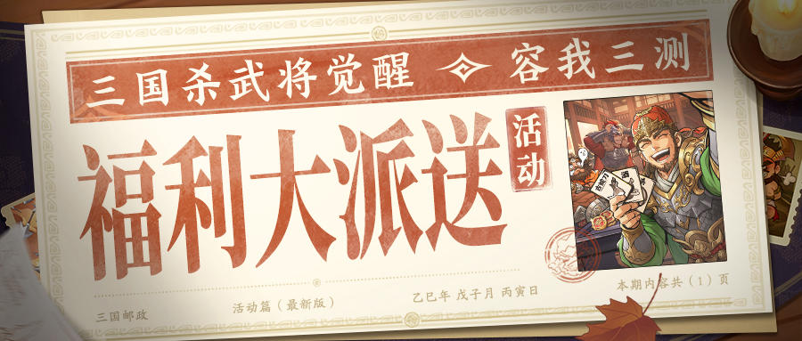 「容我三测」期间,在TAPTAP、抖音、Bilibili三个平台任意发布一条《三国杀武将觉醒》相关作品,联系官方成功登记后就送公测限定称号与游戏周边,累计播放更有大额京东卡直接送!