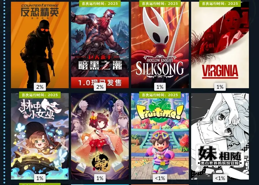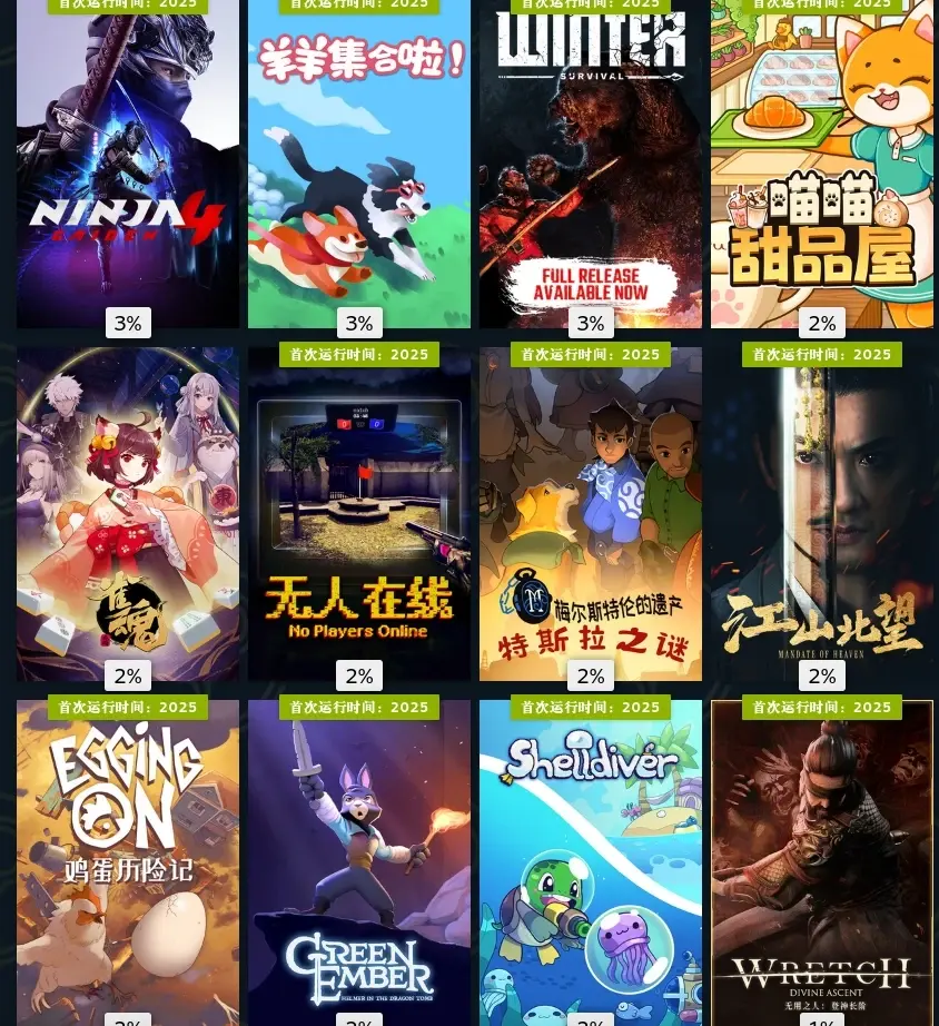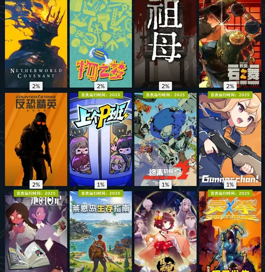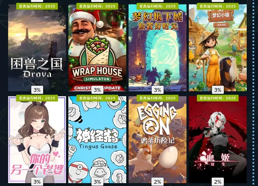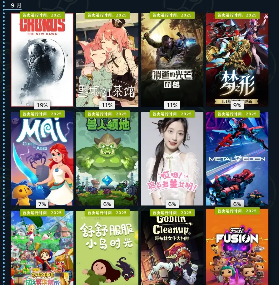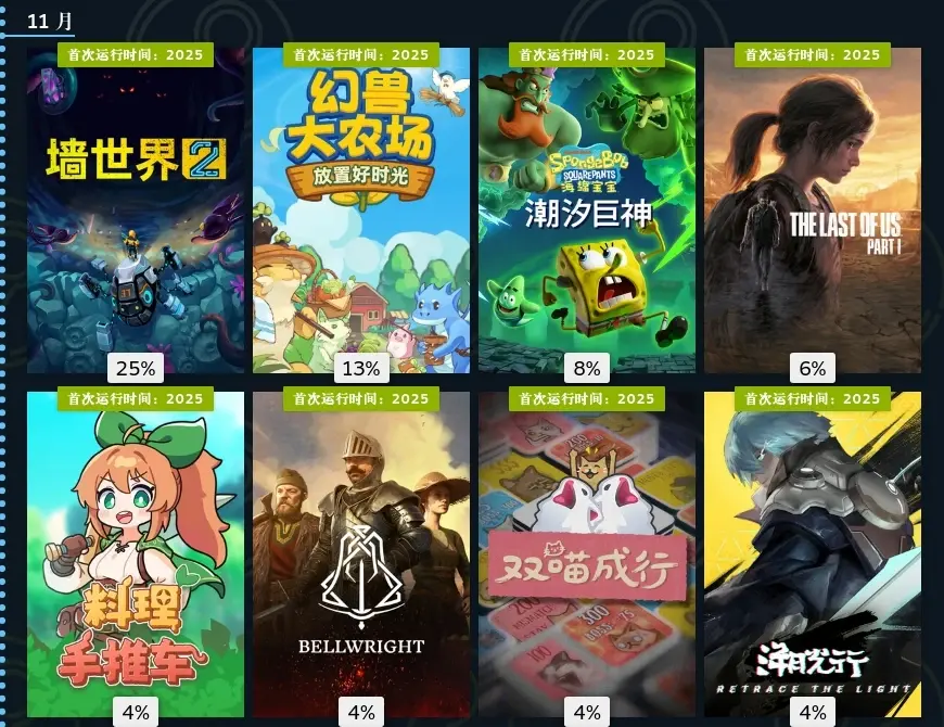 十一月,墙世界2挖矿肉鸽玩法,看我游玩占比就知道有多上头了。海绵宝宝潮汐巨神,粉丝作,但做的还不错,喜欢海绵宝宝可以无脑入。双喵成行,小丑牌那种卡牌肉鸽,但更加简单易上手,还是猫猫主题。溯光行,本月最惊艳的游戏,回溯玩法和美轮美奂的美术非常出彩,国产游戏。羊羊集合啦,多人合作赶羊。江山北望,晋朝为背景的影游,还不错。鸡蛋历险记,看看主播玩玩得了。登神长阶,电子斗蛐蛐。