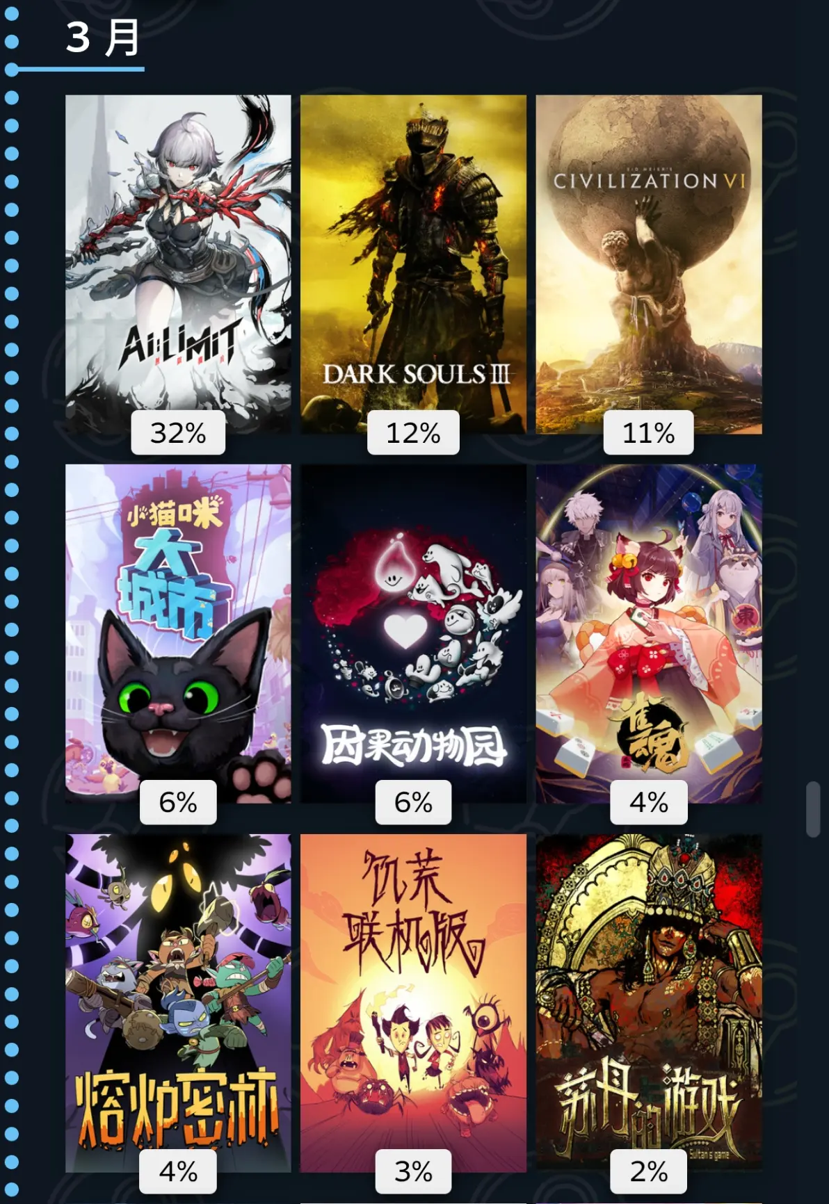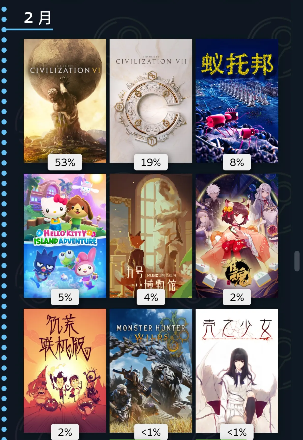 二月,我们万众期待的文明七来了,玩了之后我立马回去玩文明6了,懂得都懂。蚁托邦是将蚂蚁分为不同部件的资源采集加自动化管理的游戏,意外的上头。凯蒂猫纯纯手游移植,但量大管饱,粉丝作。九号博物馆是模拟经营冒险游戏,有大量的文物,讲述了他们的故事,立意不错。荒野玩不下去。