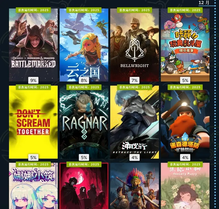 十二月,龙与地下城战痕,很不错的桌游,目前有两个剧本和若干地牢,可惜没中文。云之国,类塞仿原缝合怪,中规中矩。颂钟长鸣,更新了新地图,更偏向rpg玩法了,之前地图是领主模拟器。玩具乱斗屋,电子斗蛐蛐。不要尖叫联机版,沉浸感很足的恐怖主题步行模拟,和朋友一起玩很好玩。焦虑小狗,来源于社畜内心深处的恐惧,战胜他吧!困兽之国,很不错的rpg游戏,小巧精致。卷饼店,和朋友一起联机卷饼,节目效果很足。神经鹅,太癫了这游戏,担心作者的精神状态,自动化管理建设游戏。血姬双生,街机格斗游戏,内容偏短。