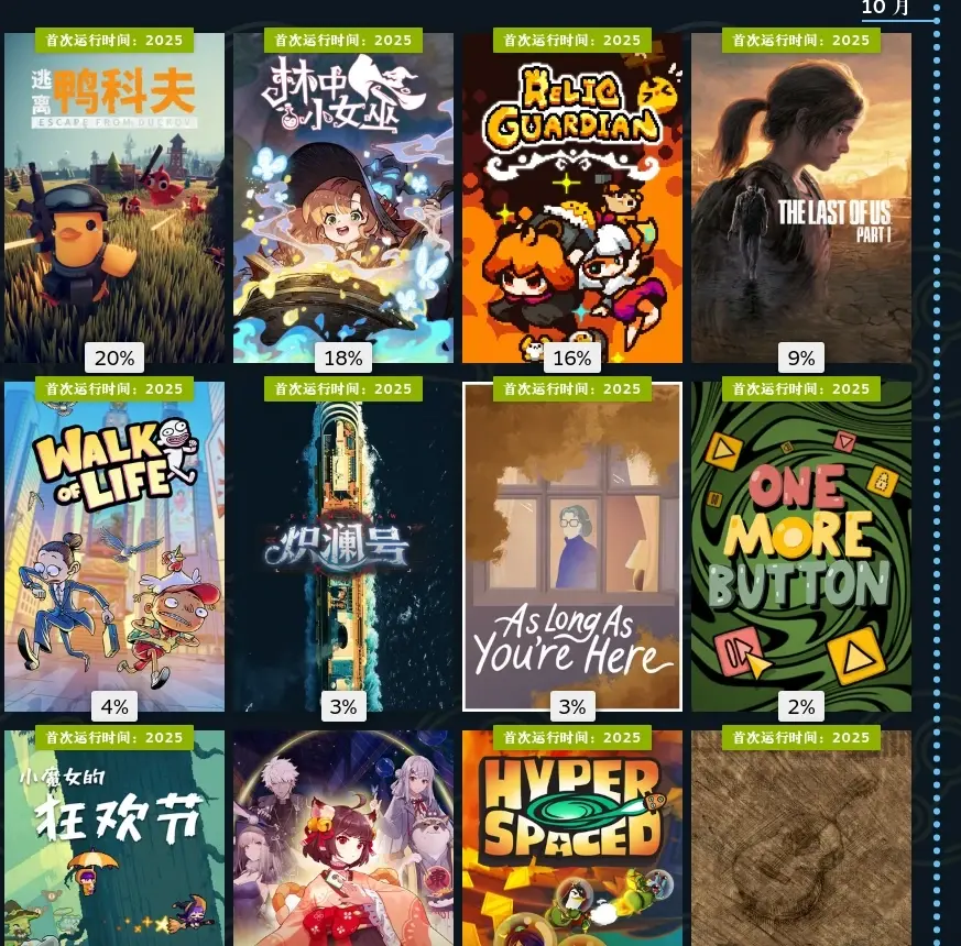 十月是属于那个黄皮鸭子的,正值三角洲行动作死之际,b站发行的逃离鸭科夫横空出世,席卷朋友圈,大家都在玩,如果没有这次的运营事故,鸭科夫还会有更好的未来。林中小女巫,女巫主题冒险游戏,这次是转正了,可可爱爱谁不喜欢?只愿有你,老年痴呆主题游戏,很感人。