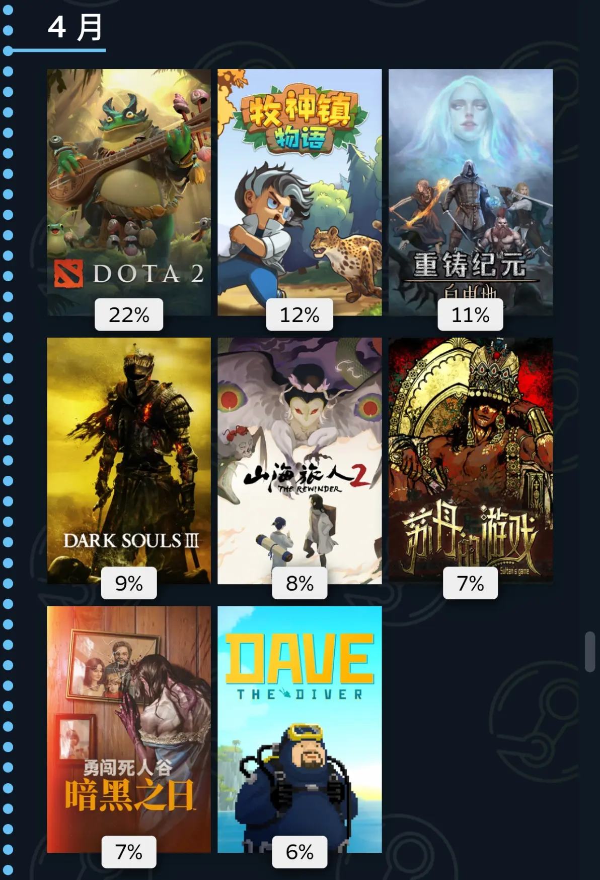 四月玩了牧神镇物语,非常好玩的一款基地建设冒险游戏,就是有些肝。勇闯死人谷,好游戏的雏形已经有了,如果制作组能完成那些画的饼就是一款好游戏。这个月还参加了山海旅人2的发布前内测,游戏改为了动作冒险玩法,在原本逆梦玩法上增加了战斗和成长内容,算是一次:不错的创新,bug比较多,但还在测试可以原谅。