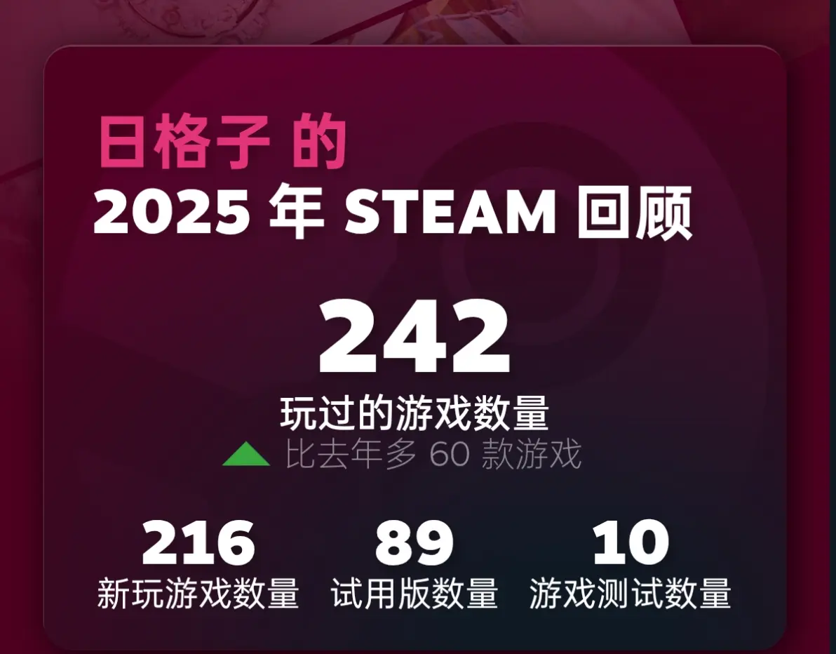 全都介绍完毕,做个总结吧,这个数据是到冬促之前的,冬促我还购入了幻想生活i转圈圈的龙和偷取时间的少女,也挺好玩的,今年的游戏生活还算充实,我算是一个深度的游戏玩家,把游戏当做第九艺术看待,以前小时候懵懂无知,玩的都是腾讯的网游,现在想来虽然也有欢乐但只是消磨时光的工具,现在踏入社会之后再来玩,游戏俨然已经成了我生命的延长线,在另一个世界过着现实生活无法经历的人生。我一直不理解网上的云玩家在评论区狺狺狂吠,为了一些事情一定要和别人争个高下,这不是失去了玩游戏本身的意义了吗?云玩家不会真正为游戏中死去的一个角色哭泣,除非你真的经历过那段故事。