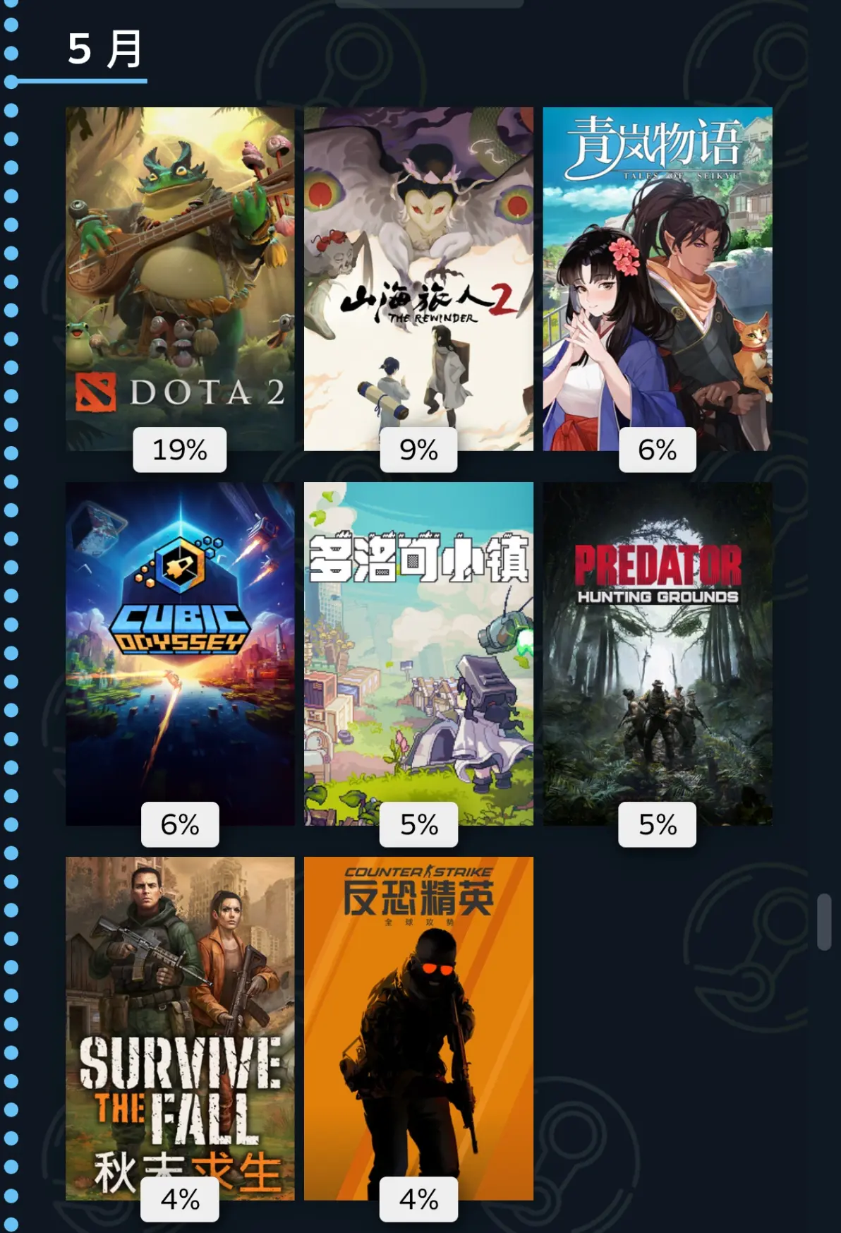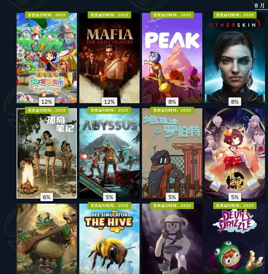 八月,牧场物语的经典之作,集市系统的加入让种田的生活更添乐趣,种田游戏爱好者今年的必玩之作,强烈推荐。黑手党新作,演出不错画面不错,但祖传的没好结局,干了那么多还是马仔。otherskin,不错的射击游戏,拥有多种变形能力。孤岛笔记,和美女的荒野求生。abyssus,第一人称射击肉鸽,内容偏少。地球上的罗伯特,今年又一款末世种田游戏,但与多洛可不同的是,这次是机器人农场。the rpg,很多梗很怪的rpg游戏。恶魔细雨,微恐的平台跳跃游戏,小孩子出门但丢失了伞,为了寻回朋友的故事,更像是黑暗童话,日本人的作品太癫了。垃圾场大王,挖挖挖。小小书店,我经常幻想退休了可以做什么,似乎游戏中开书店的想法不错,模拟经营游戏。一起bnb,弯弯的簧游,更了新内容。向生而死,血腥的恐怖游戏,类似于逃生那种一直有人追逐的玩法。herdling,牧牛模拟器。