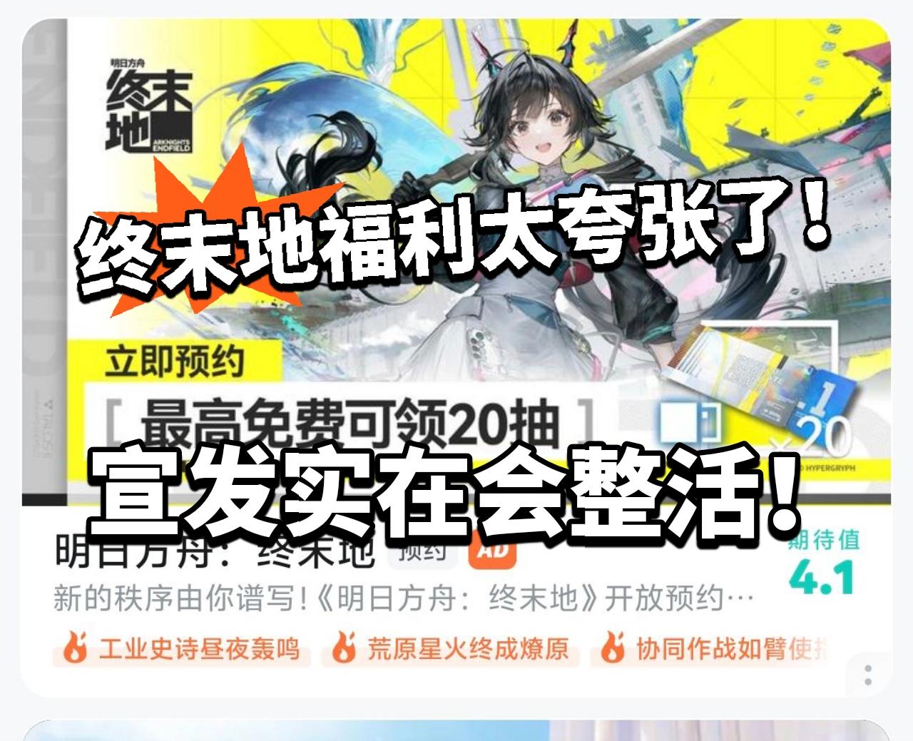 大的来啦家人们!近日 明日方舟:终末地居然罕见的再次冲上热搜! 这次是宣发乐子。 大张旗鼓放宣发图,结果却写着预约最高免费领20抽!这事儿直接引发热议。